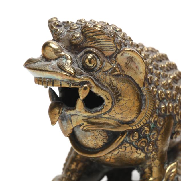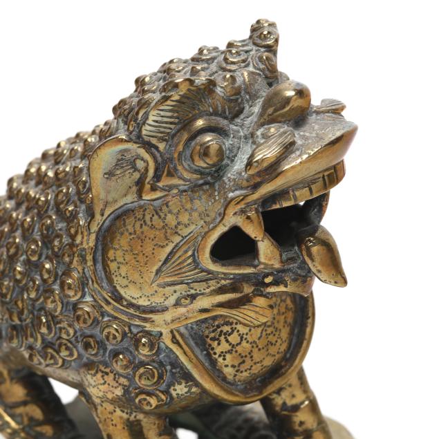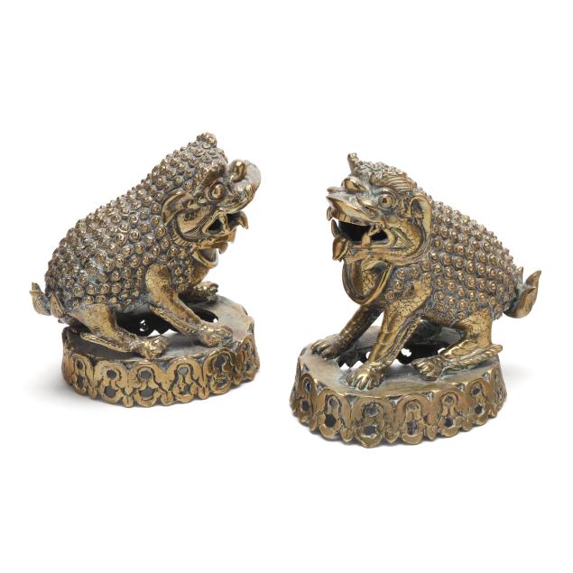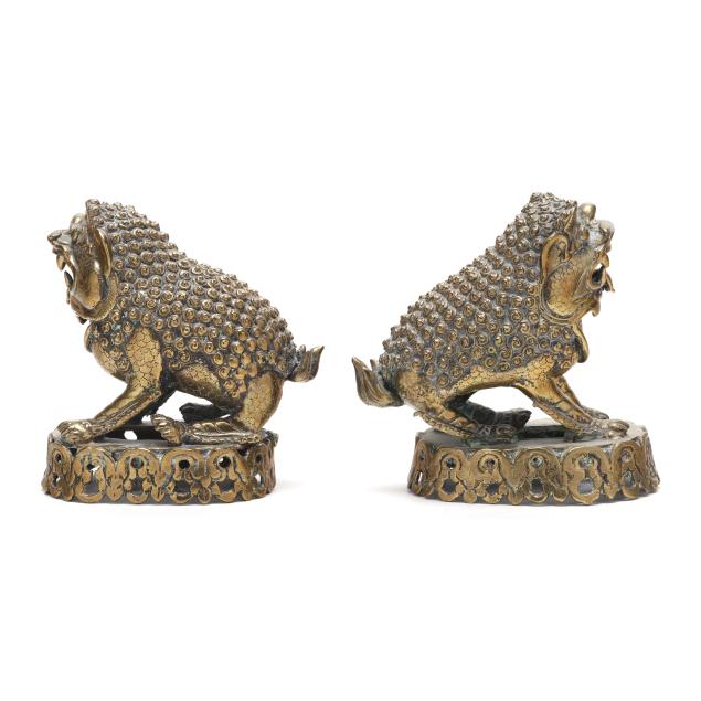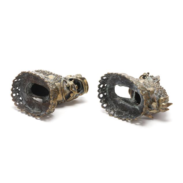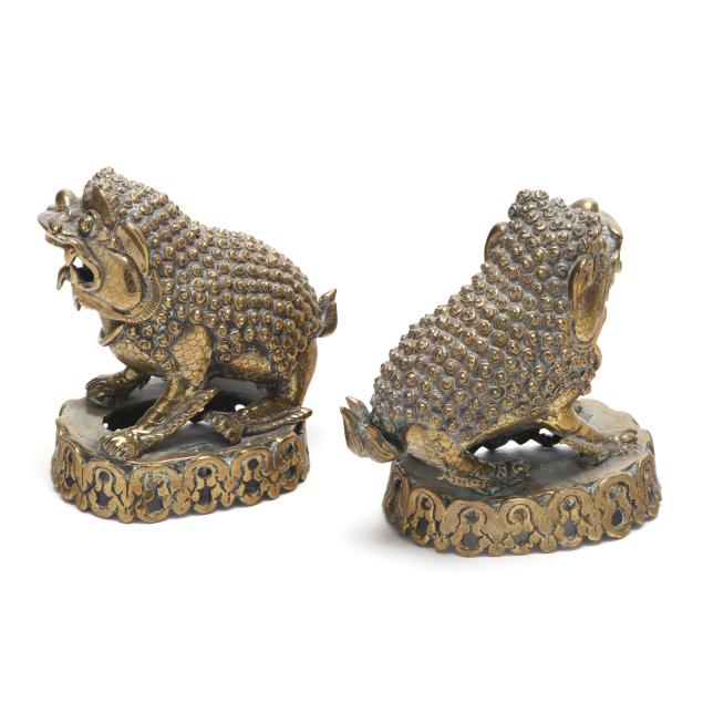 Late 19th or early 20th century, each cast as a recumbent mythical beast with bulging eyes, open jaws revealing fangs, and a curling tongue, the bodies richly textured with tight spiral curls and raised bosses, the musculature articulated along the legs and shoulders, they stand alert atop pierced oval bases cast with scrolling foliate motifs.