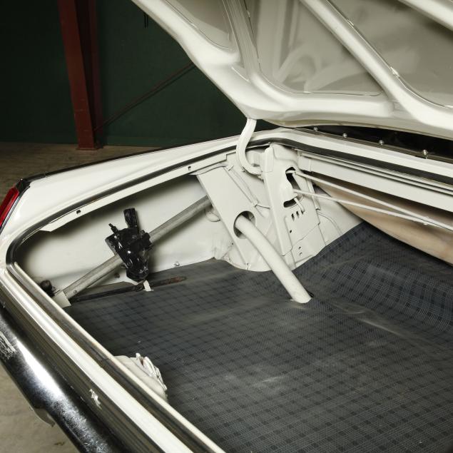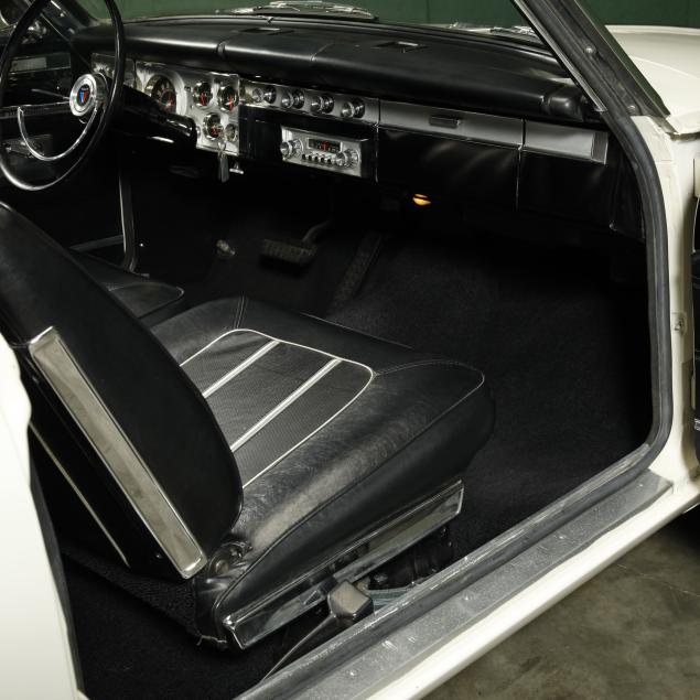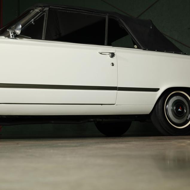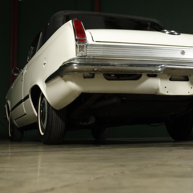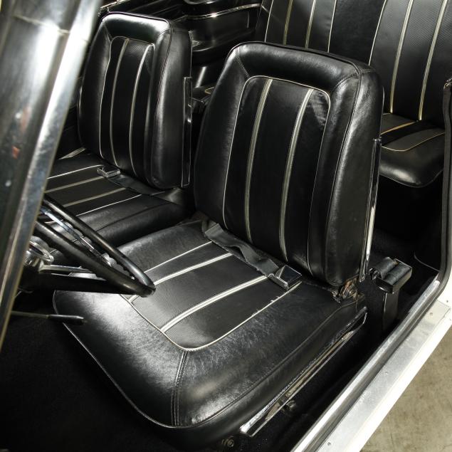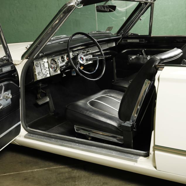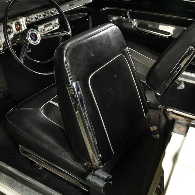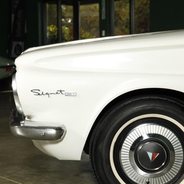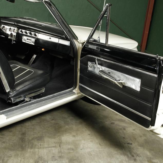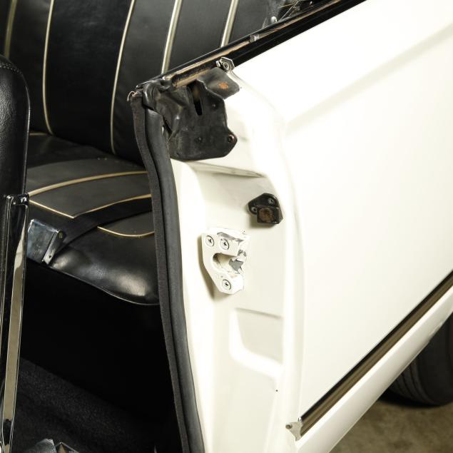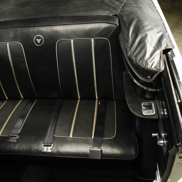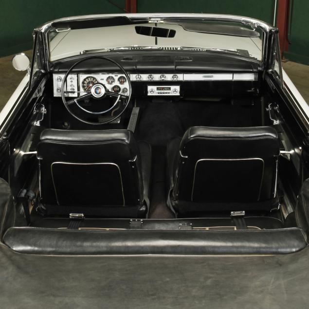 The premium Signet 200 package offered a more luxurious interior, and a powered convertible top model. This one has a repaint in the original white, with the premium black custom tailored vinyl interior. The interior is mostly original, with a refurbishment during the repaint. It appears the doors and dash repainted, with front seat covers, and new carpet. The original AM radio operates.