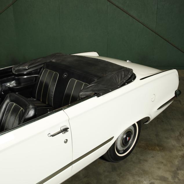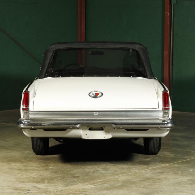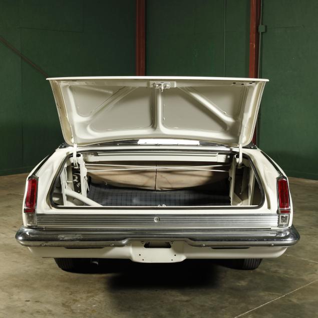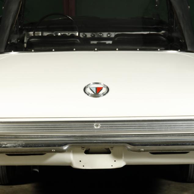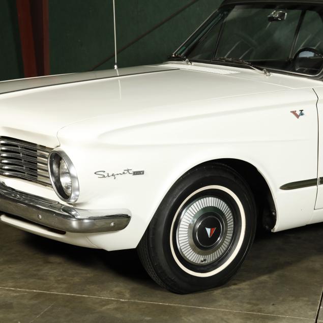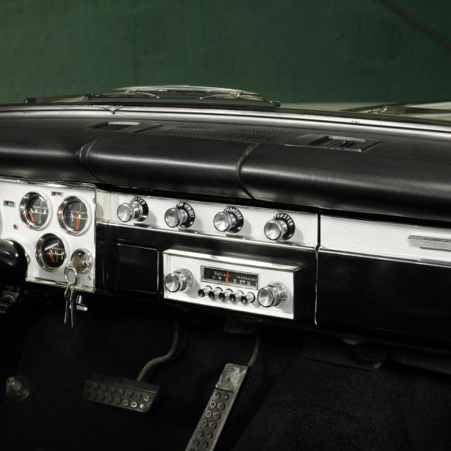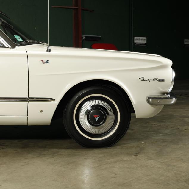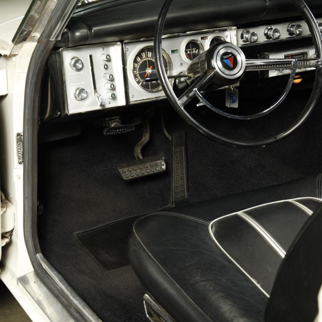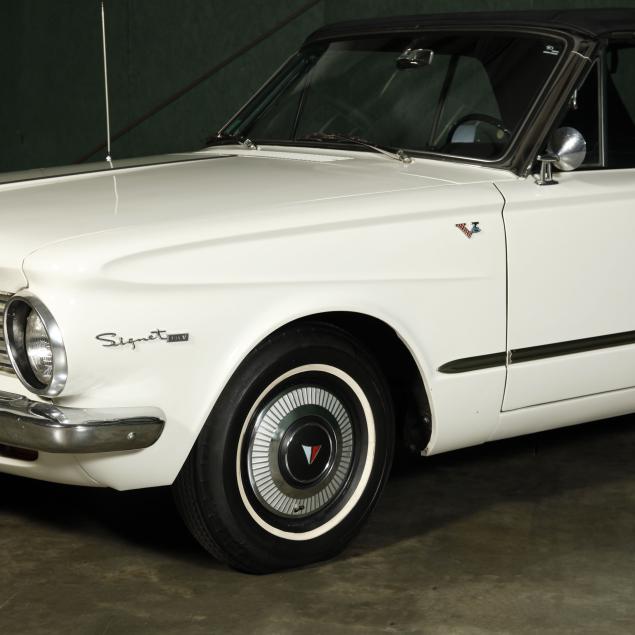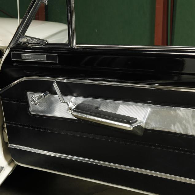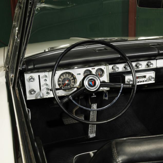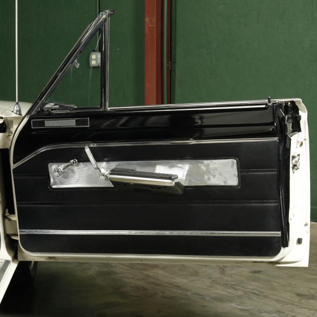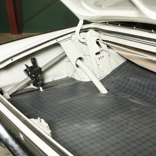 The premium Signet 200 package offered a more luxurious interior, and a powered convertible top model. This one has a repaint in the original white, with the premium black custom tailored vinyl interior. The interior is mostly original, with a refurbishment during the repaint. It appears the doors and dash repainted, with front seat covers, and new carpet. The original AM radio operates.