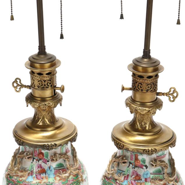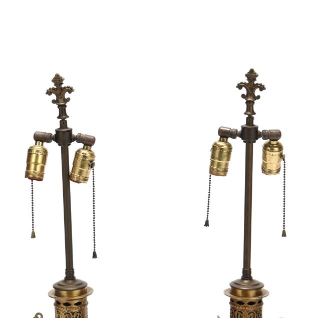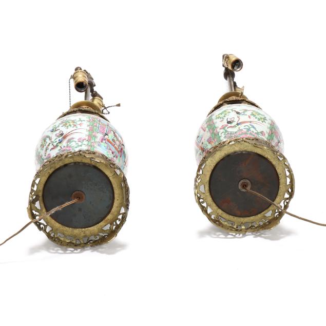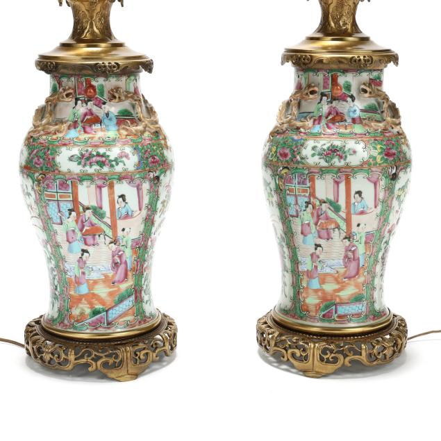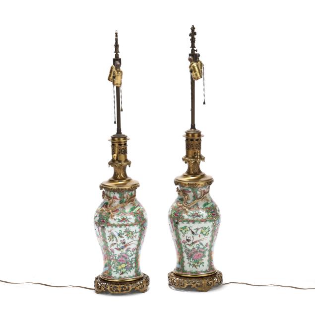 Very good estate condition; vases drilled for lamp fitting; vases not examined outside of mounts; both lamps working at time of evaluation.