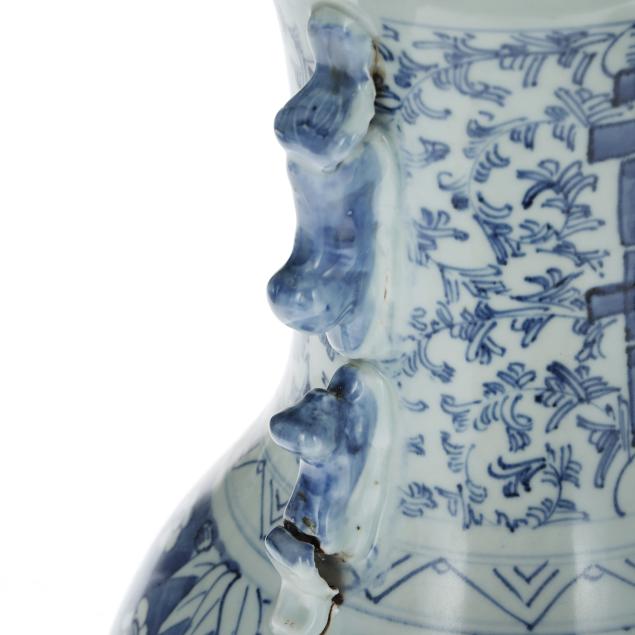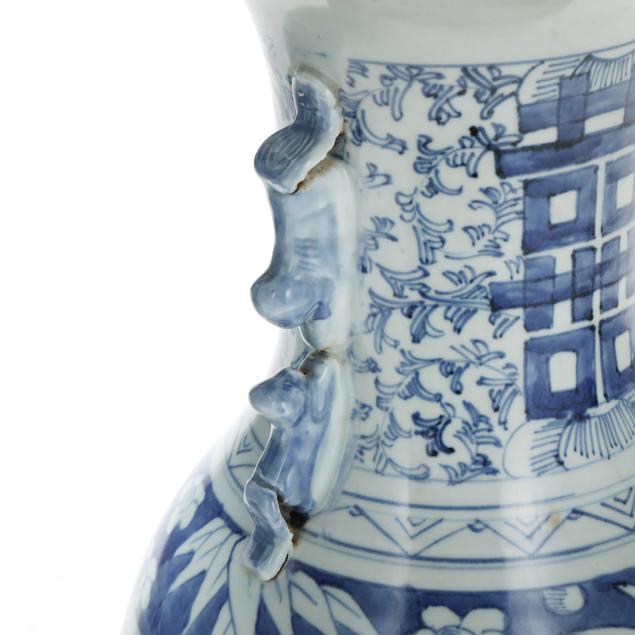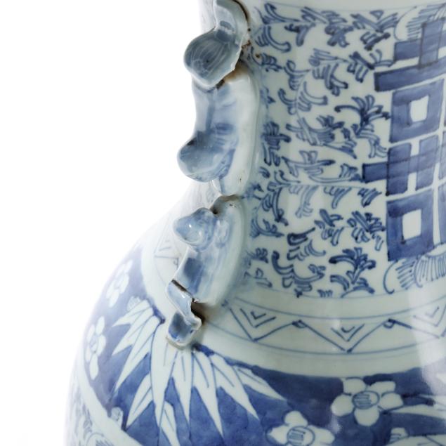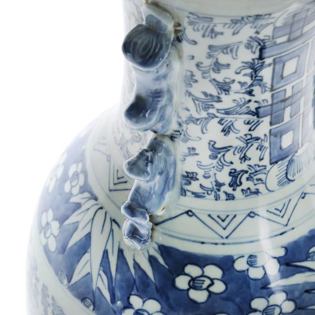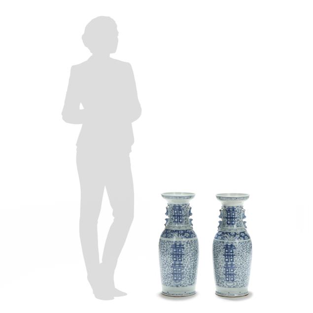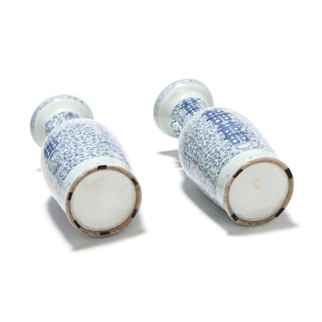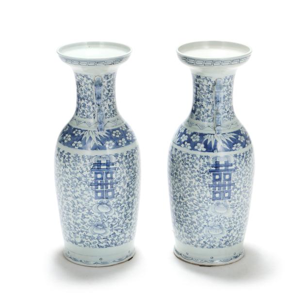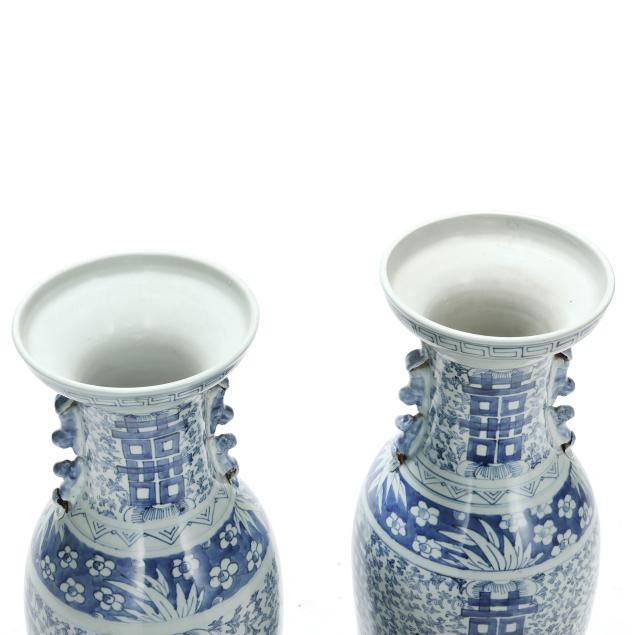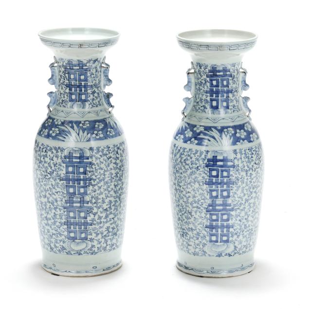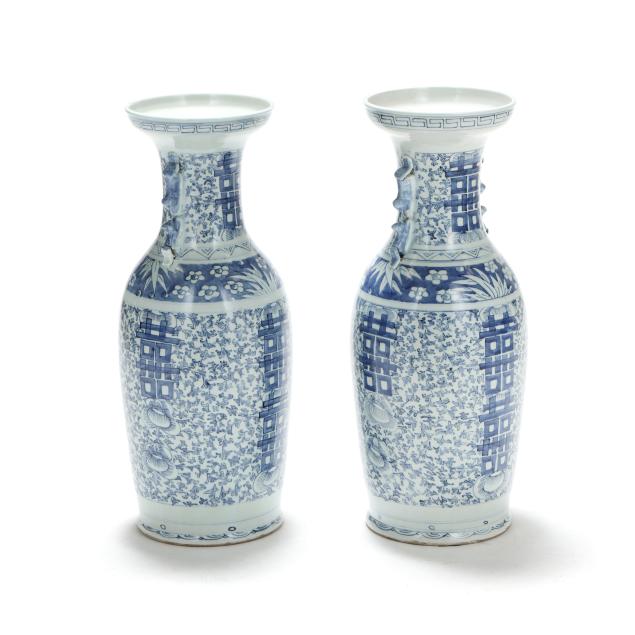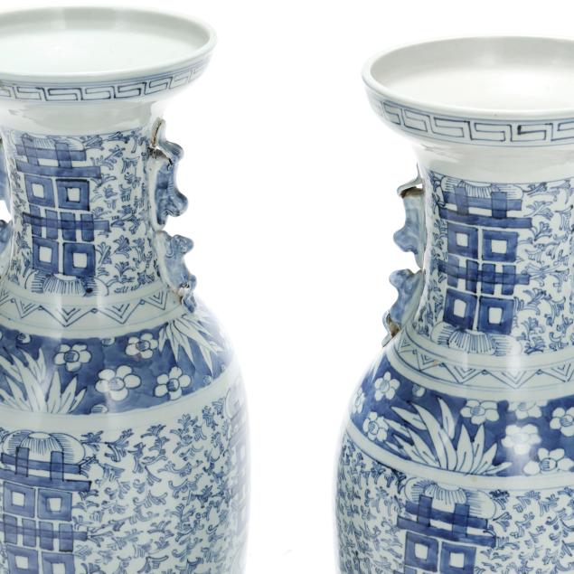 20th century, each of baluster form rising to a flared trumpet neck, porcelain hand painted in underglaze blue with scrolling floral vines enclosing a central vertical panel of stylized auspicious Chinese characters, below a band of flowering plants and above a lappet border at the foot, the necks are flanked by pairs of faux handles of a mother and baby foo lion, the rim is decorated with a key-fret border, a lovely auspicious pair.