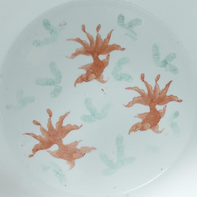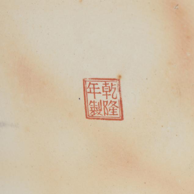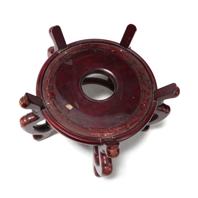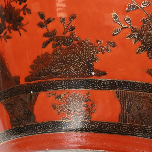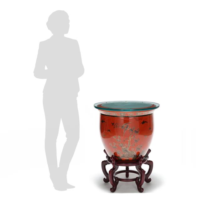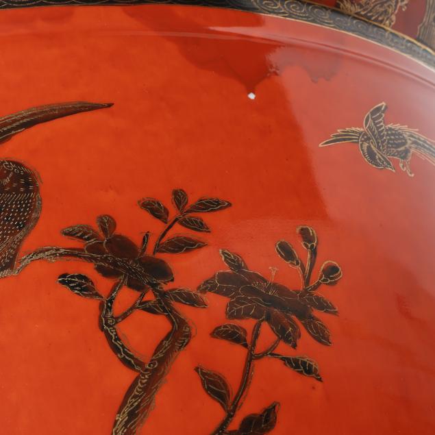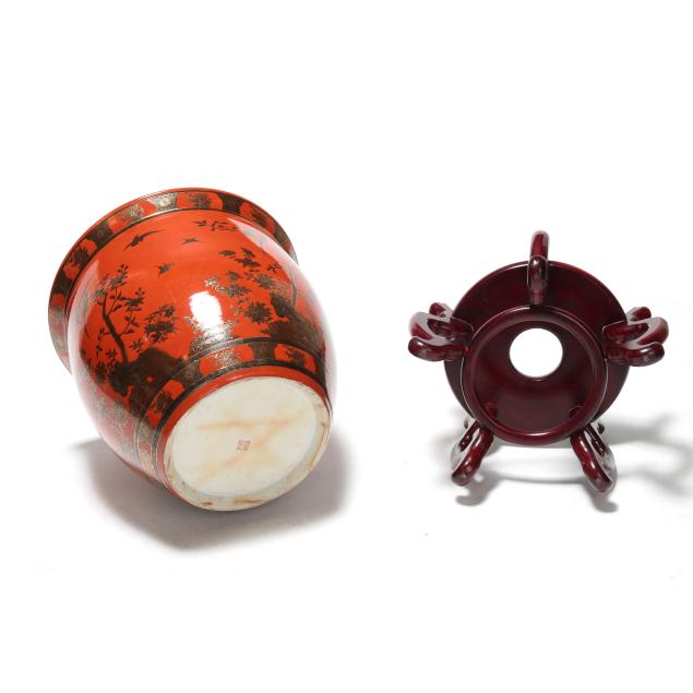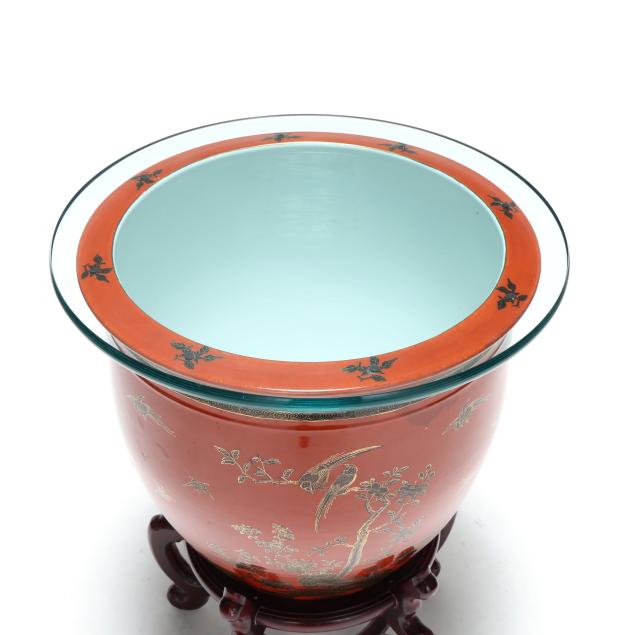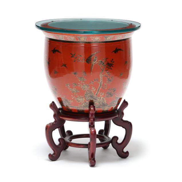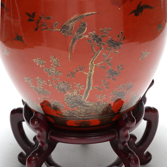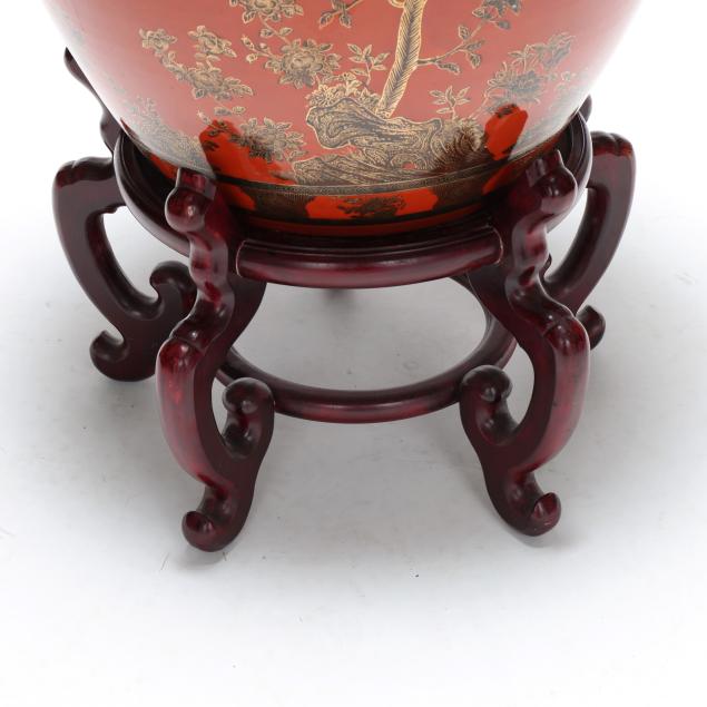 Mid to late- 20th century, the deep rounded vessel with everted rim, decorated in a rich iron red ground with gilt decoration of birds in flight amidst flowering branches, the shoulder encircled by a band of stylized foliate motifs, interior of bowl hand painted with fish and sea plants, presented with a circular glass top and atop a raised carved hardwood stand, with an apocryphal Qianlong mark to underside.