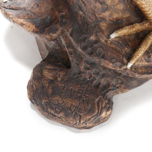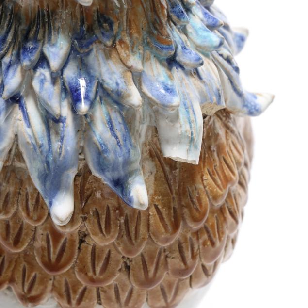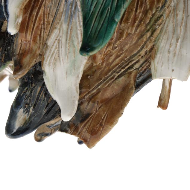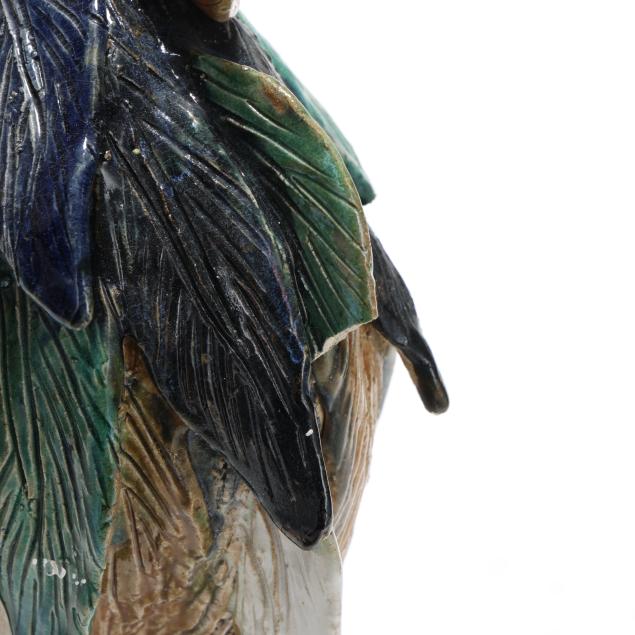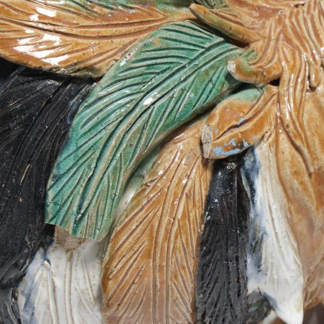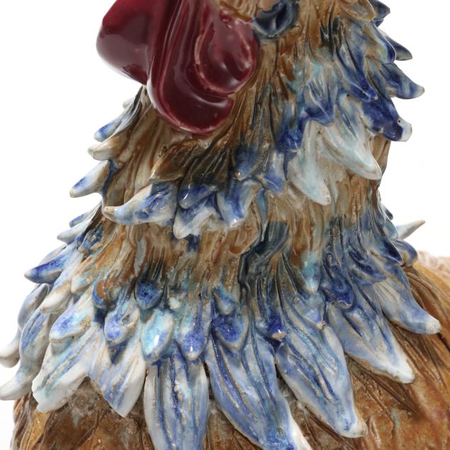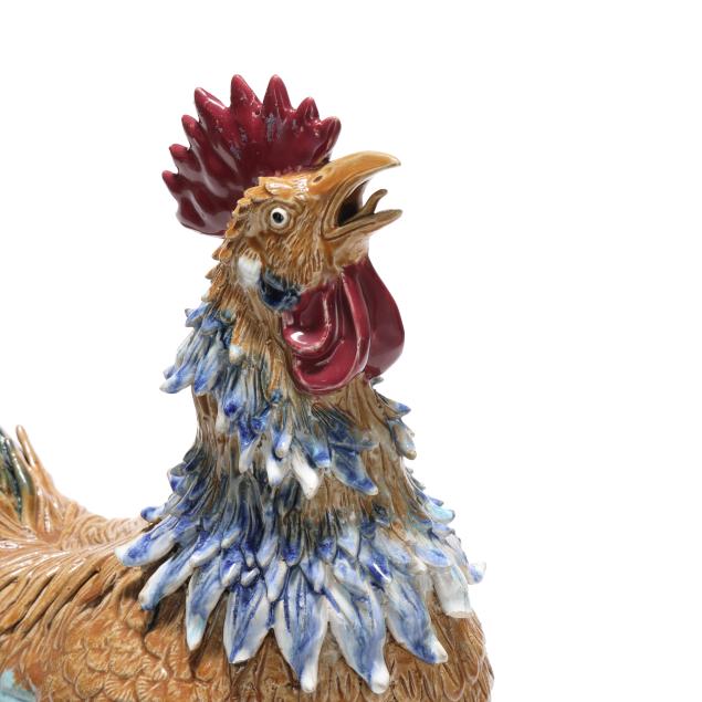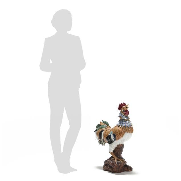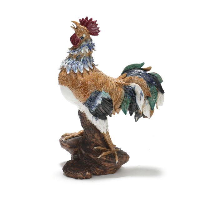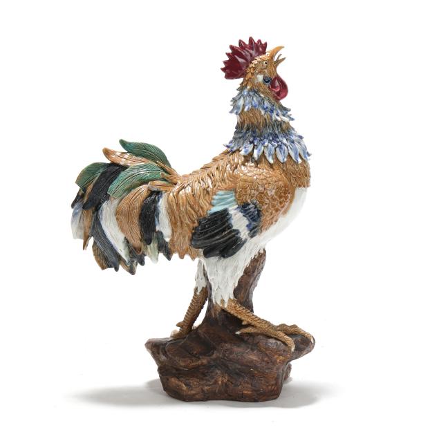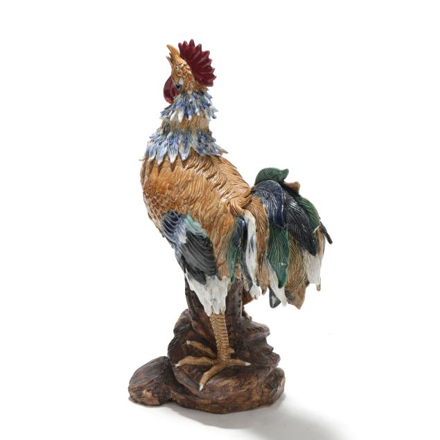 20th century, a rooster modeled standing alert atop a naturalistic rockwork base, the head raised and beak open, the body naturalistically rendered with incised plumage and applied feathers that are covered in a palette of