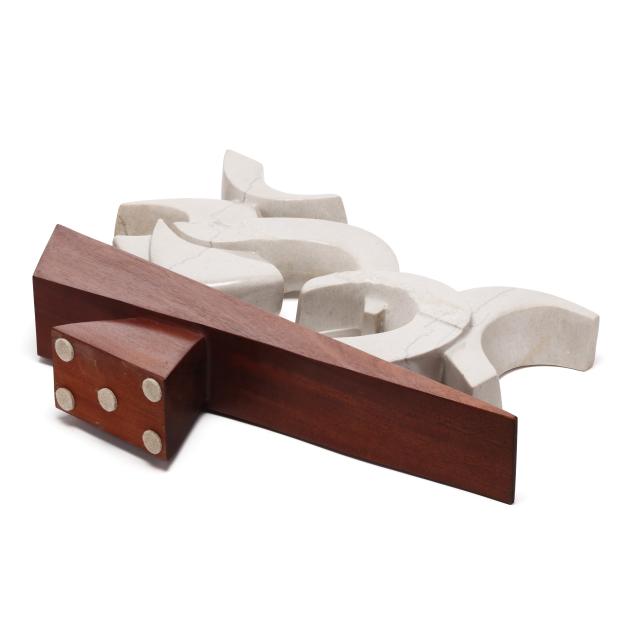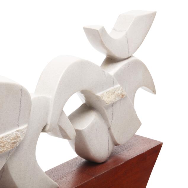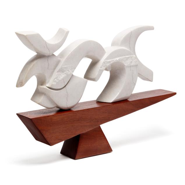Circa 2000, carved and polished light gray marble, etched signature along the lower edge, mounted atop a geometric carved walnut base.