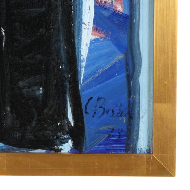Acrylic on board, signed at lower right, presented in a gilt frame.