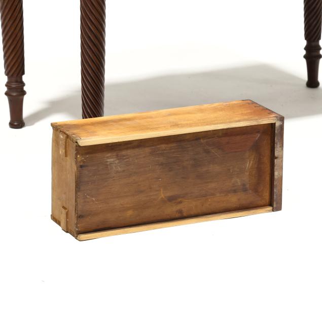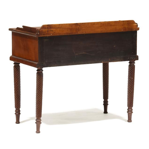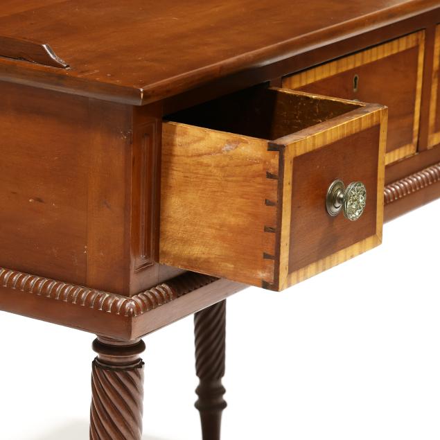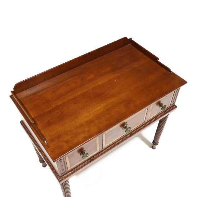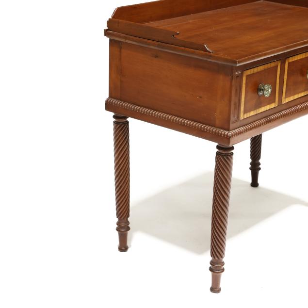 Circa 1830, cherry and mahogany with maple veneer, poplar secondary, top with applied backsplash, three banded inlay drawers, reeded skirt edge, later spiral twist legs.