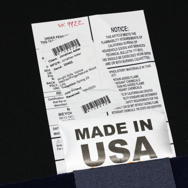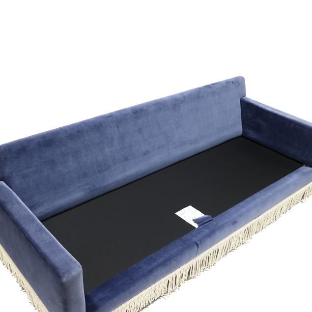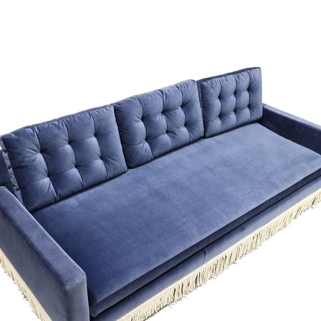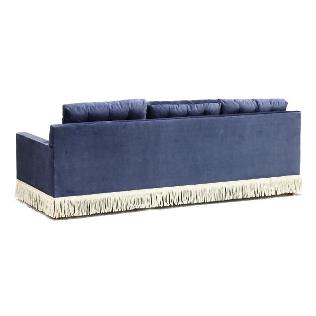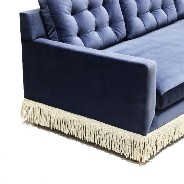 Spring 2023 line in Mariner plush upholstery with three tufted back cushions and a single loose seat cushion, tassel trim on turned wood legs, labeled.