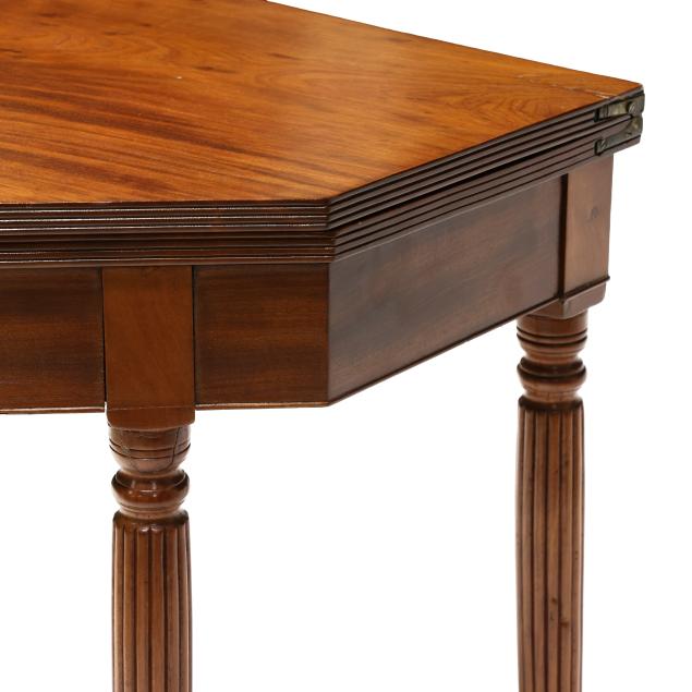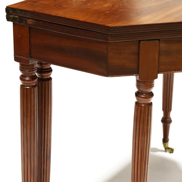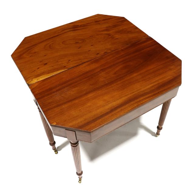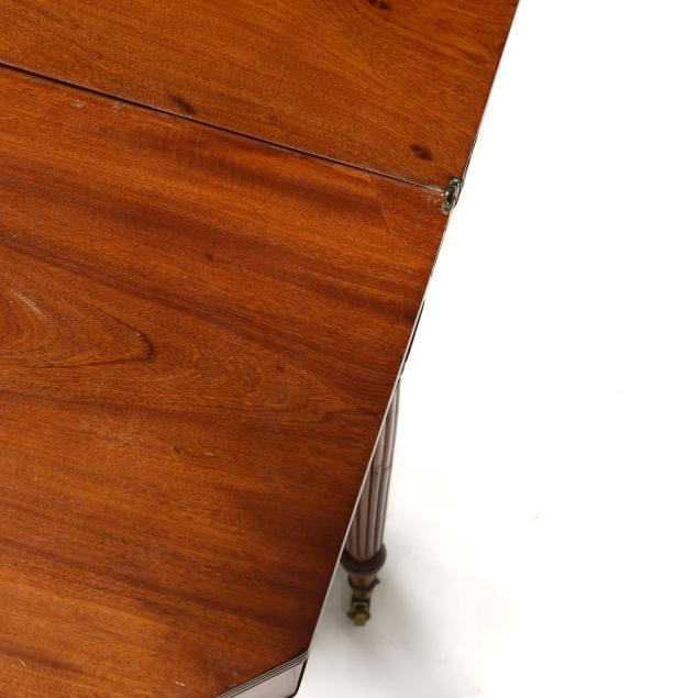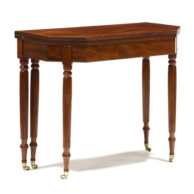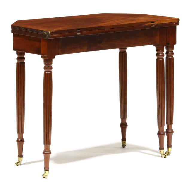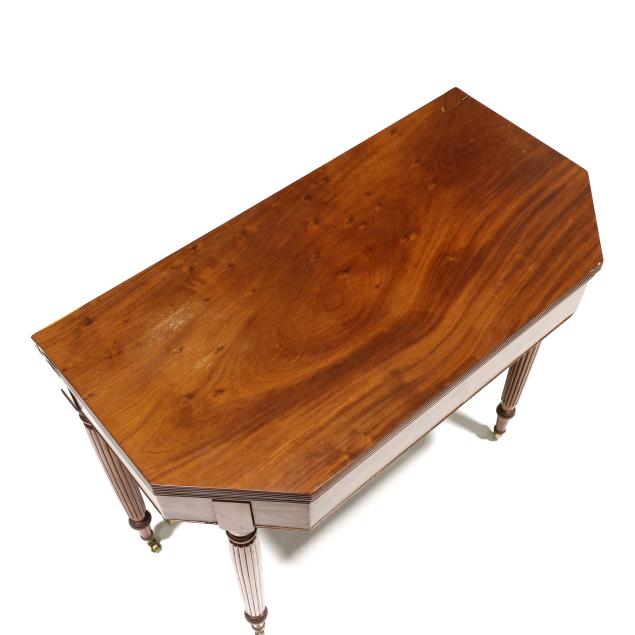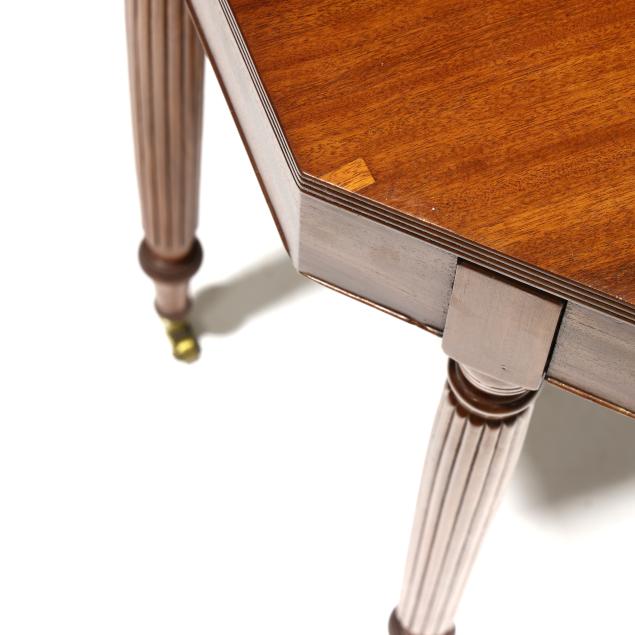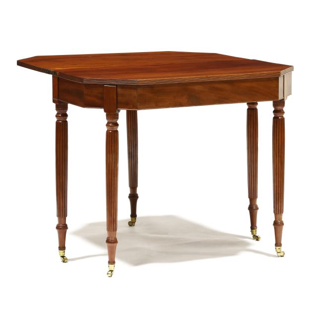 Mid-Atlantic, circa 1810, white pine and poplar secondary, solid one board top with cut corners, reeded edge, single gate-leg support, conforming skirt with cock bead edge, reeded tapered legs with brass casters.