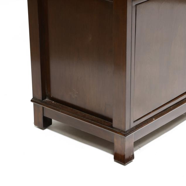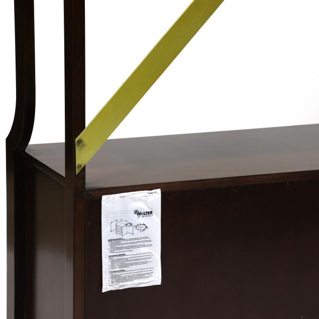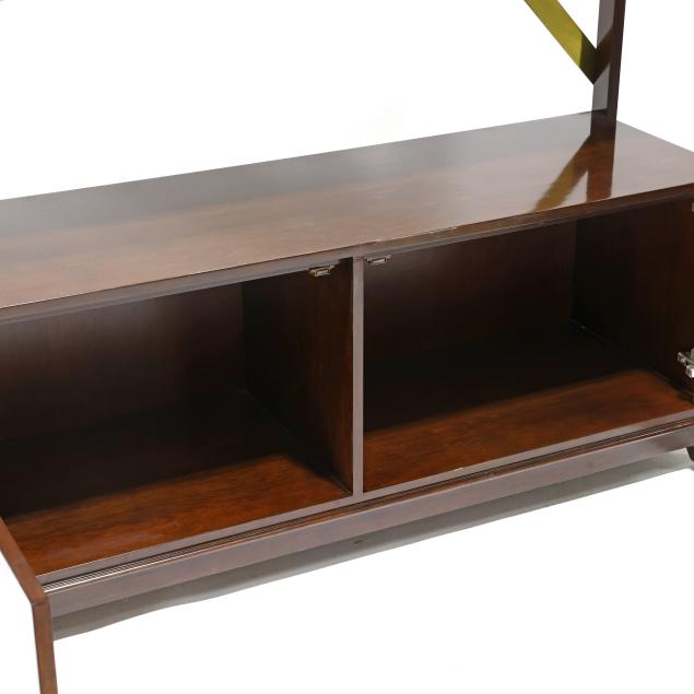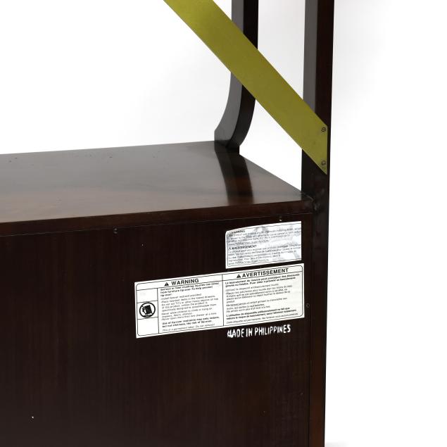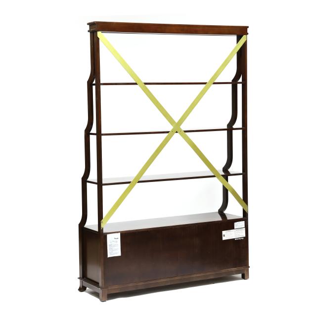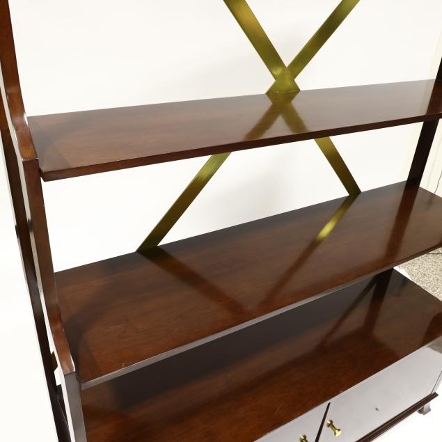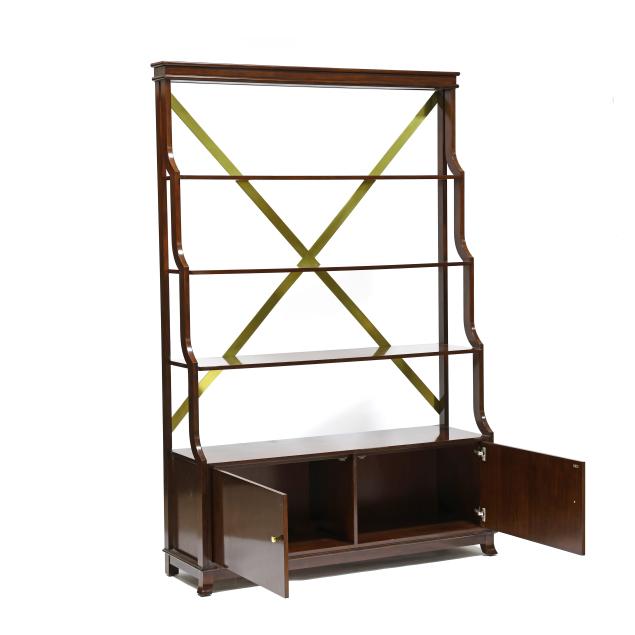 Contemporary, one part form, stepped graduated shelves with gilt metal bracing, two lower hinged cabinet doors, divided interior, unmarked.