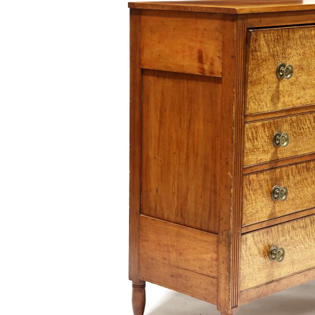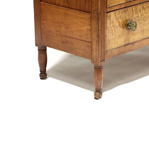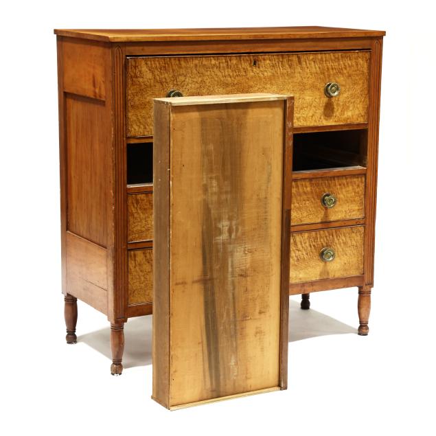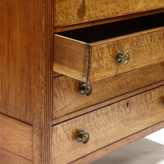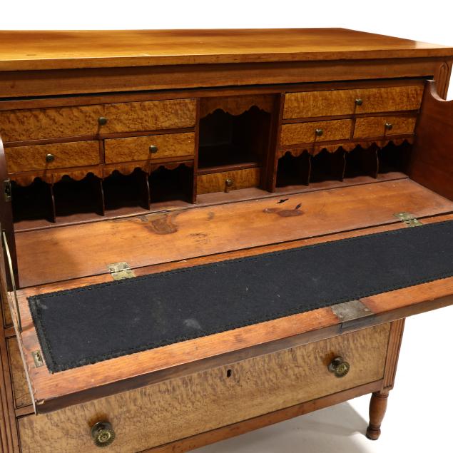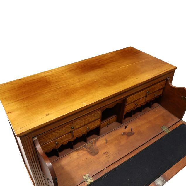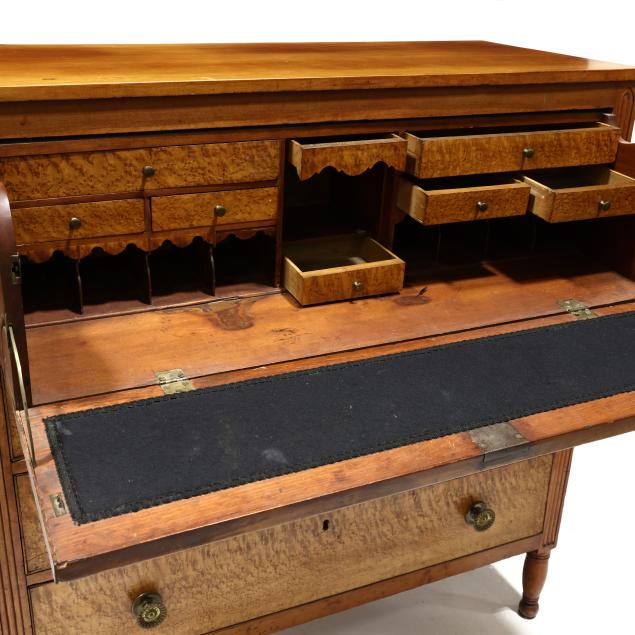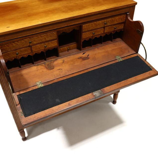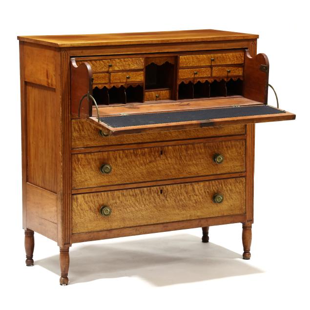 Circa 1820, cherry, maple veneer, poplar and white pine secondary, upper fall front drawer with divided and drawered interior, black baize writing surface, over three graduated cock beaded drawers, distinctive reeded stiles terminating in Gothic arch, paneled sides, turned feet.