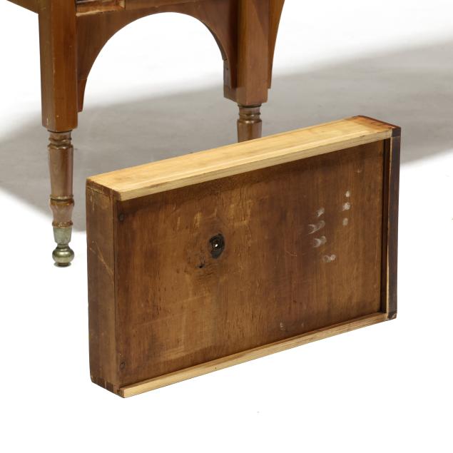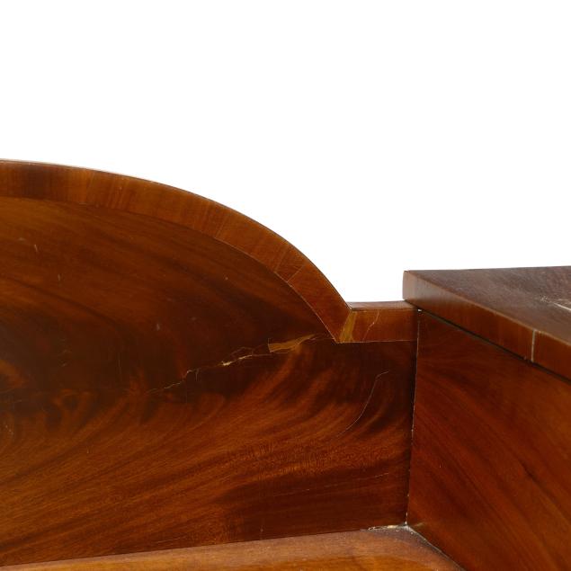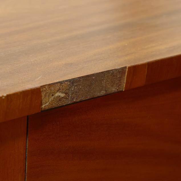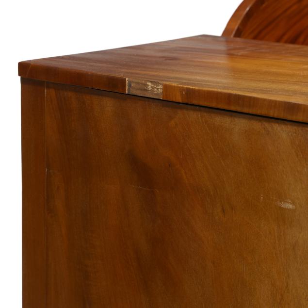 Some veneer chips and patches; old but later pulls; central drawer with plug holes; top center board with crack and central spline; left cabinet door with veneer splitting; case sides with veneer buckling and shrinkage cracks.