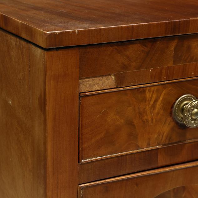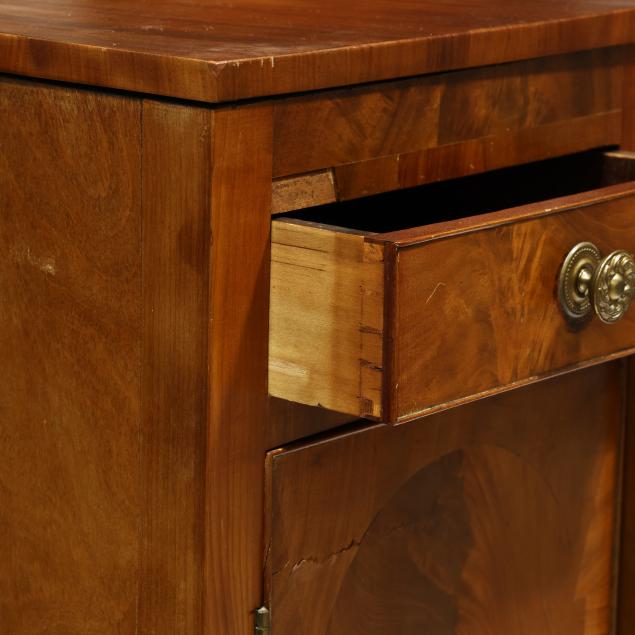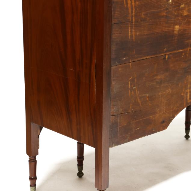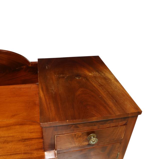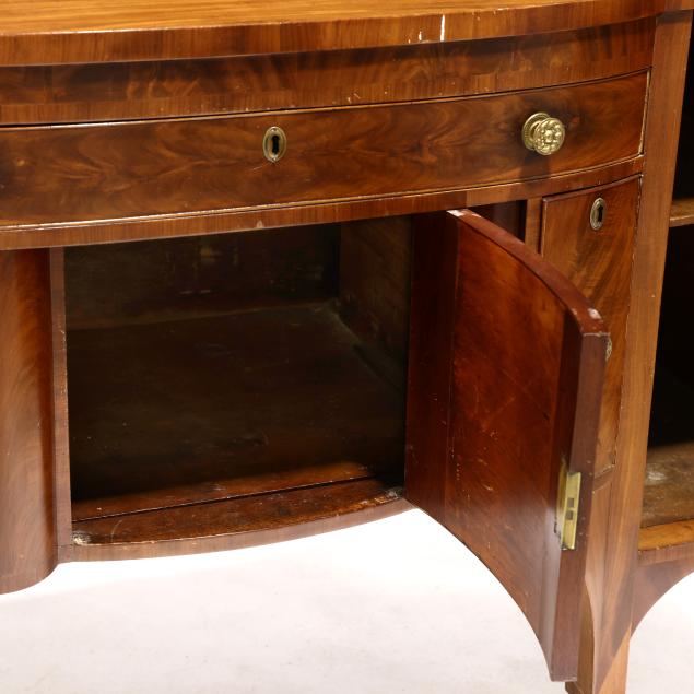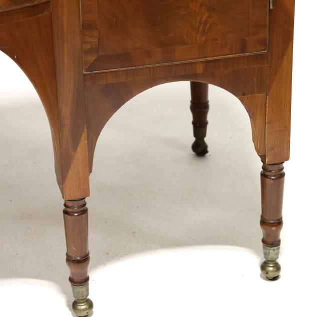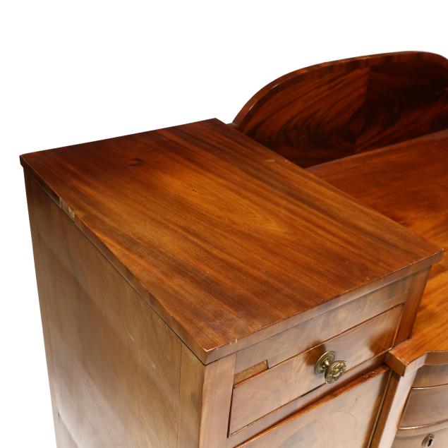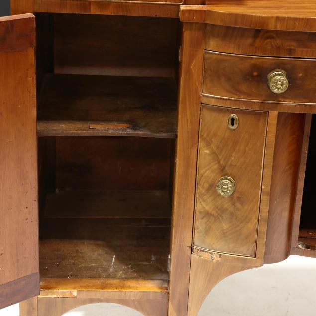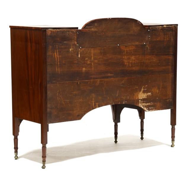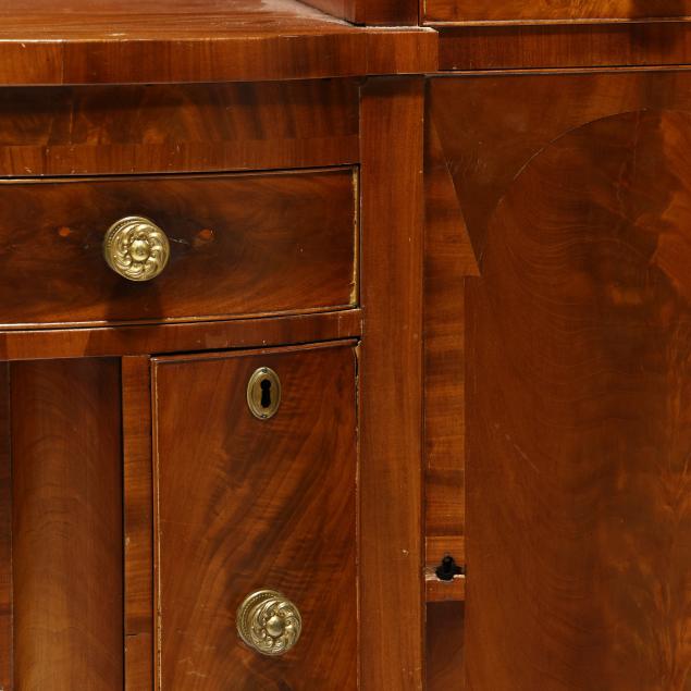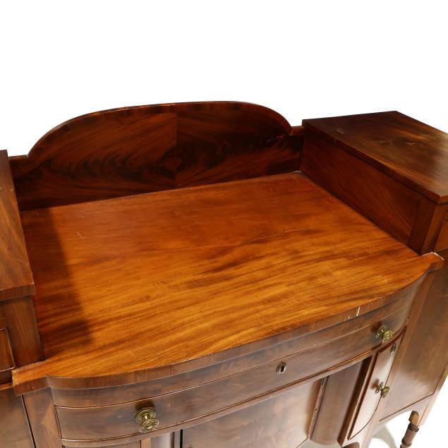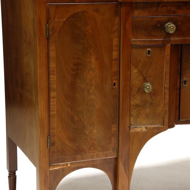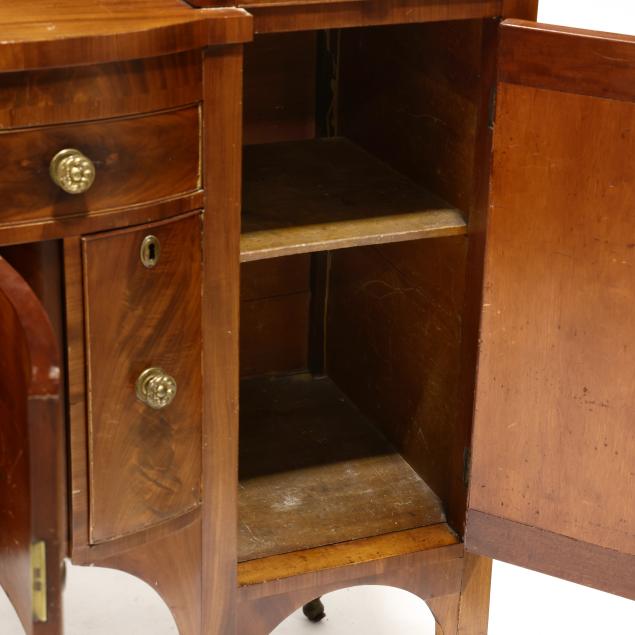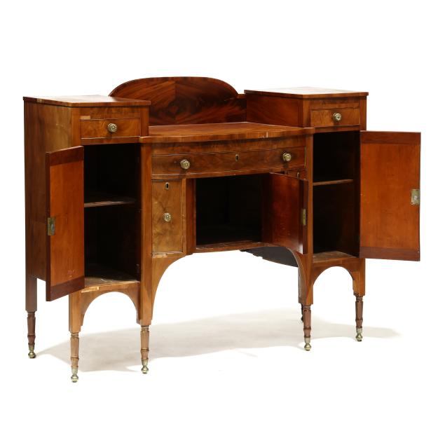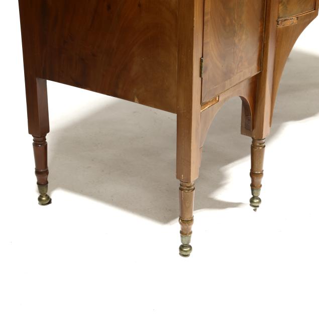 Circa 1810, mahogany, mahogany veneer, poplar and white pine secondary, arched backsplash, two upper small drawers over two hinged tall cabinet doors with shelved interior, central bow-front drawer over a recessed bow-front cabinet door flanked by two convex divided bottle drawers, flush sides, six turned legs with brass feet.