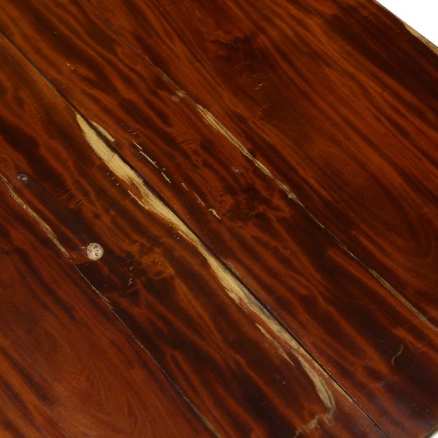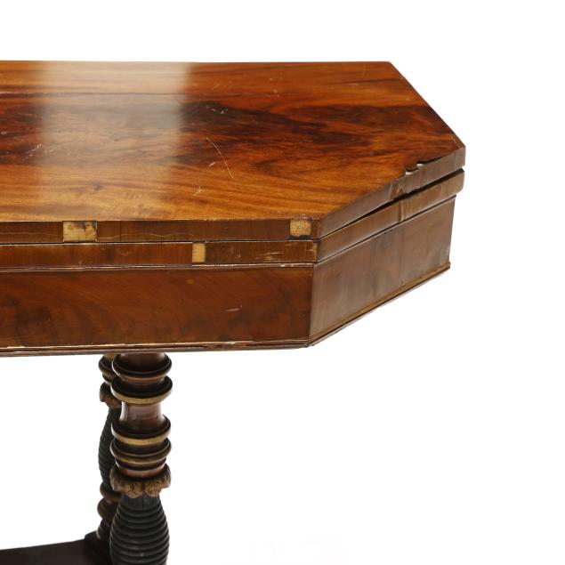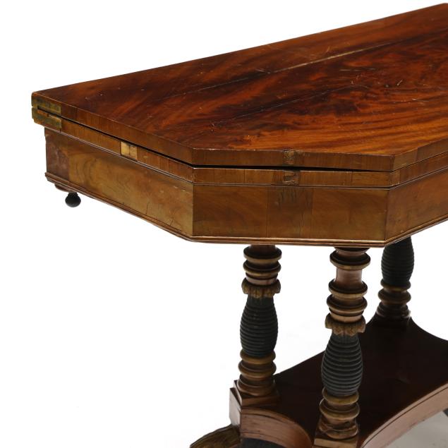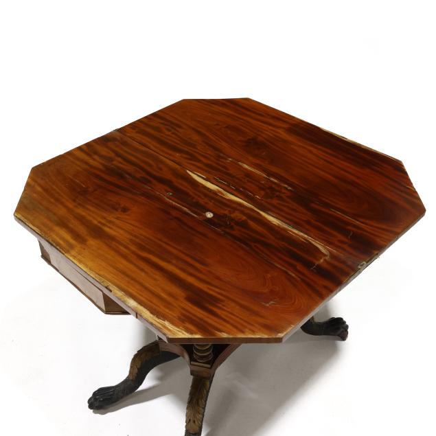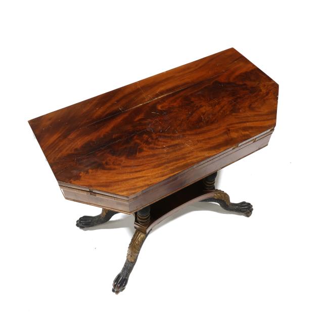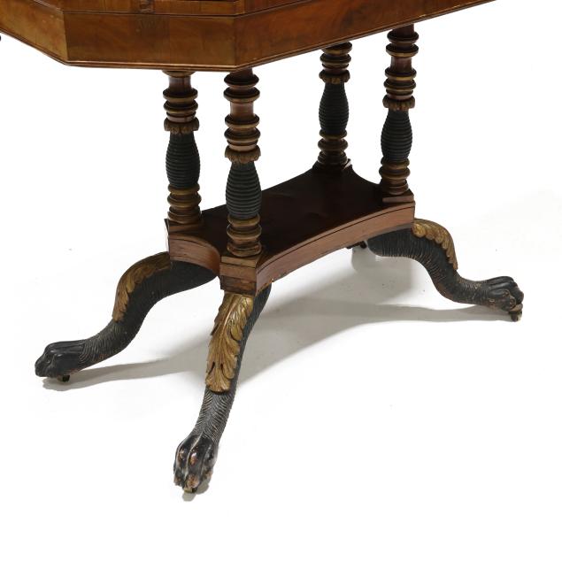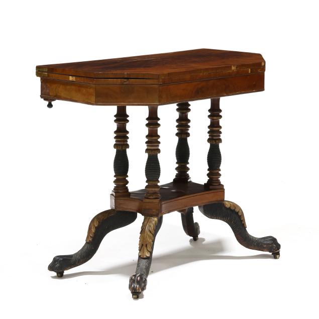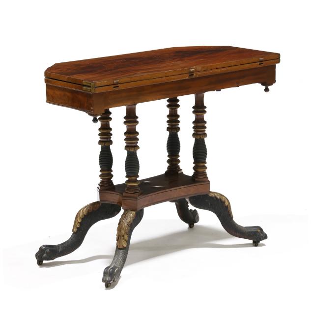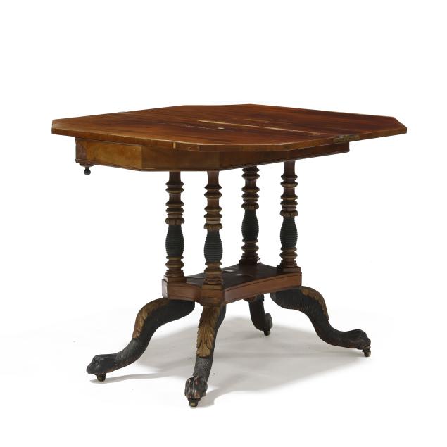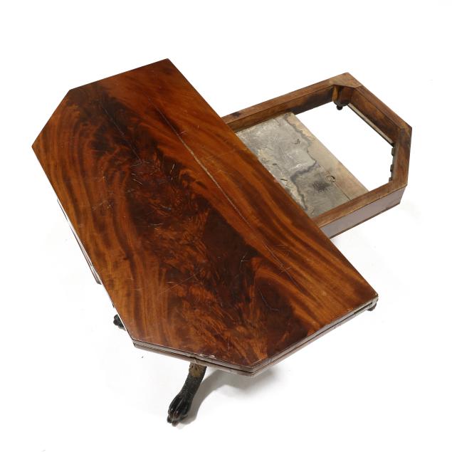 Circa 1830, mahogany, mahogany veneer, secondary in oak, walnut and poplar, swivel hinged top with canted corners, conforming apron with beaded trim, quadruped base with stacked ring columns, lower shelf on acanthus leaf and hairy paw feet on casters.