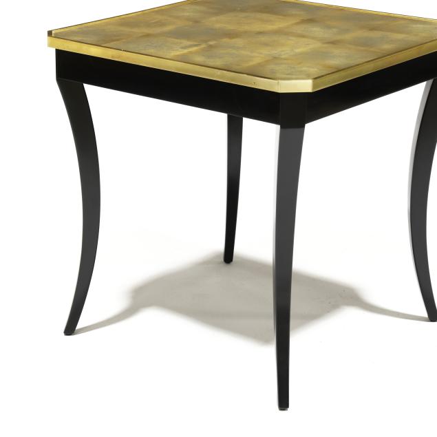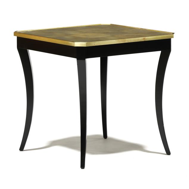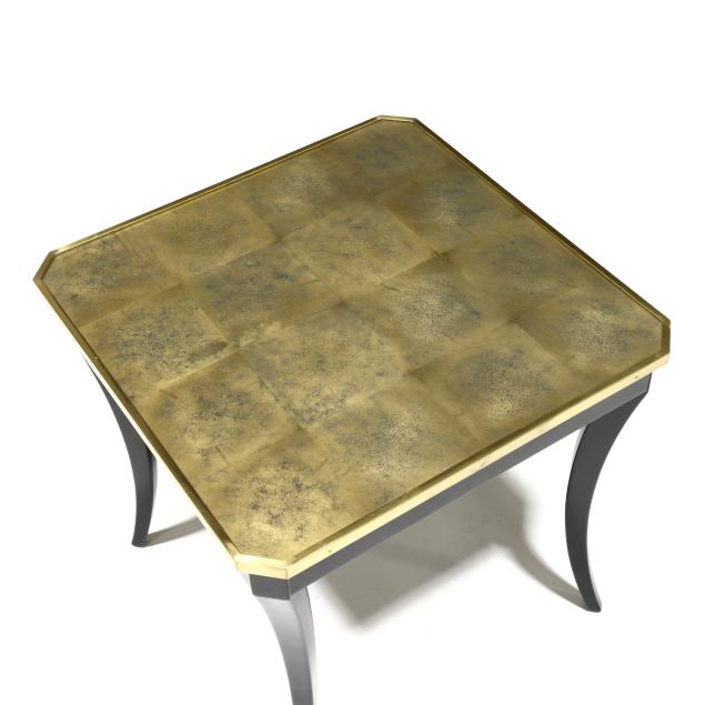 Contemporary, one part form, glass top with underside gold leaf, brushed brass trim, black lacquer saber legs, unmarked.