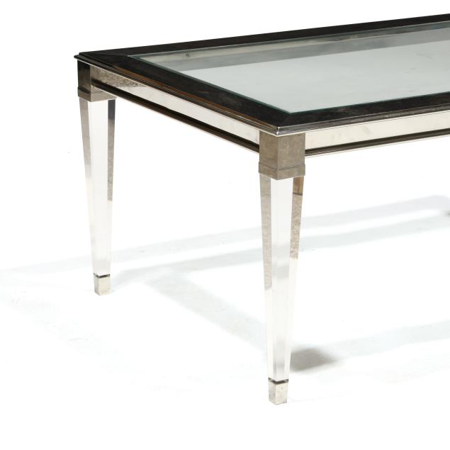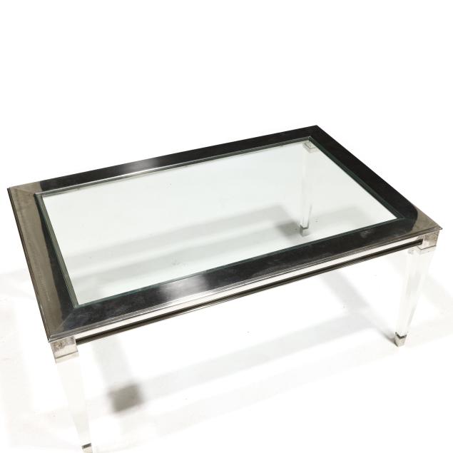 Contemporary, inset glass top, polished steel frame over straight tapered clear lucite legs, steel capped feet, unmarked.