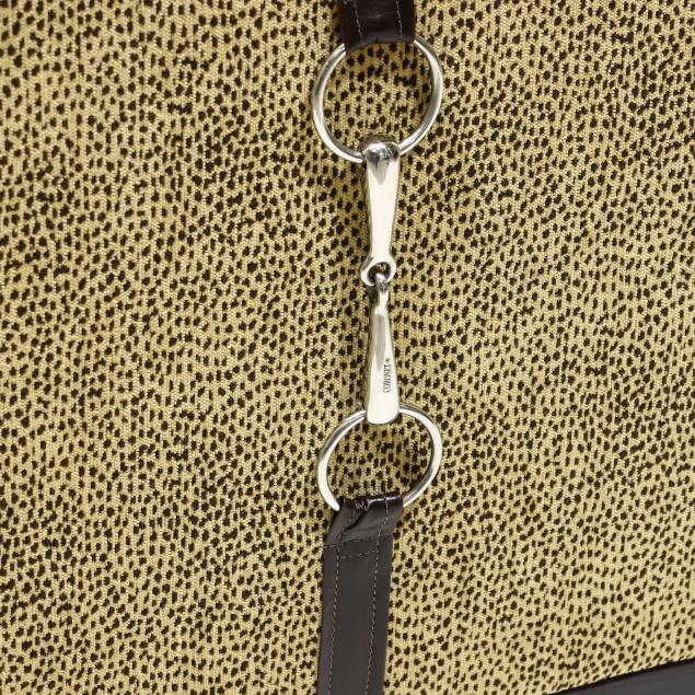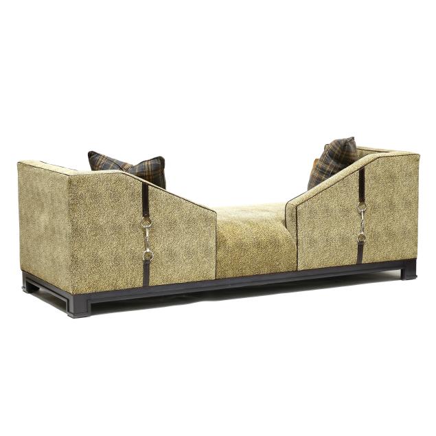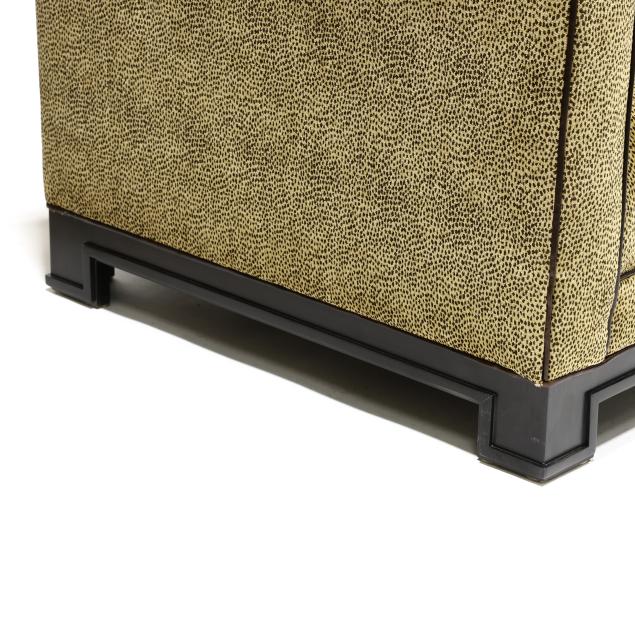 Contemporary, plush leopard print upholstery, with four throw pillows, ebonized straight legs with molded edge, the back side finished with buckle straps, labeled.