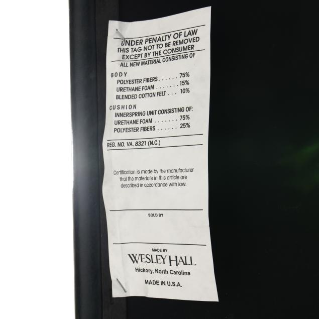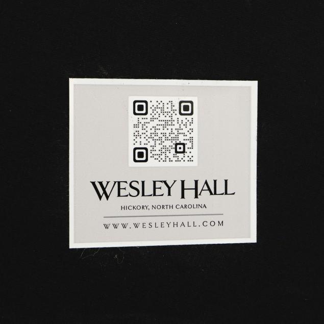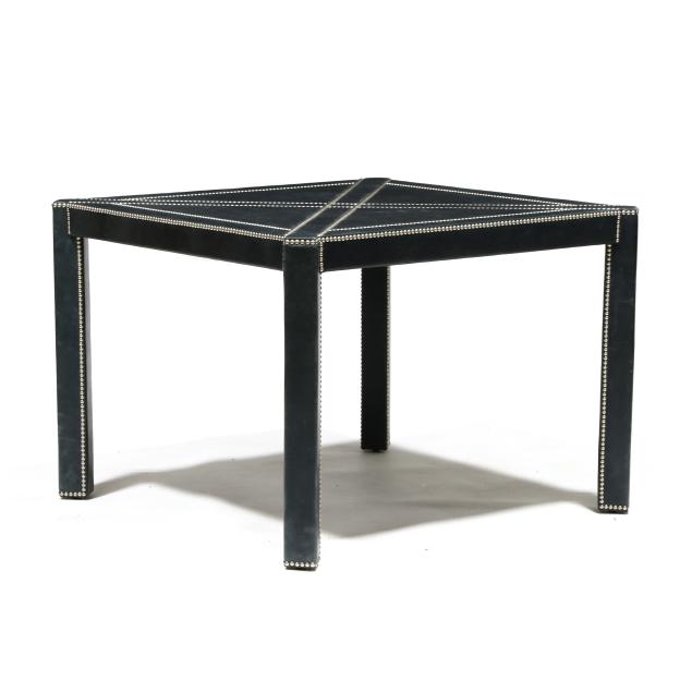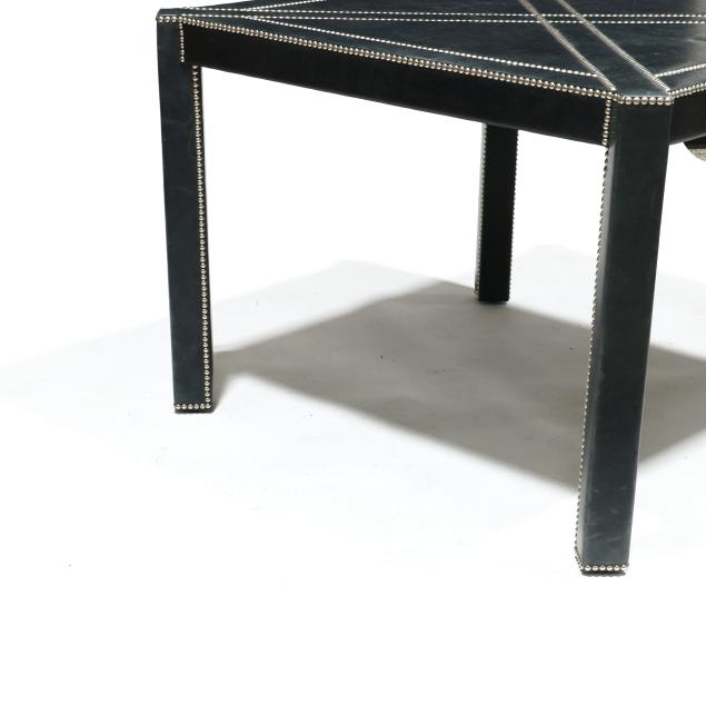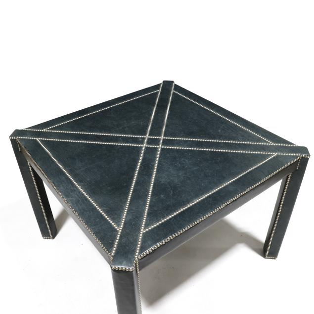 Contemporary, grey/blue leather with nickel tack trim and decoration, 45 degree straight legs, labeled.