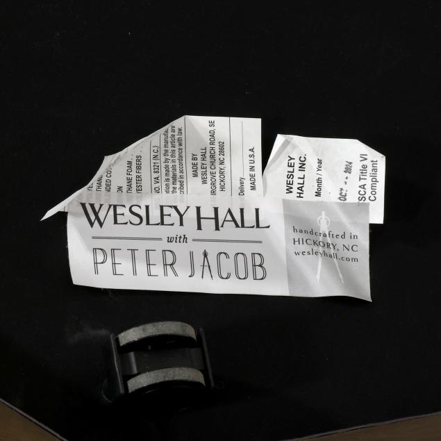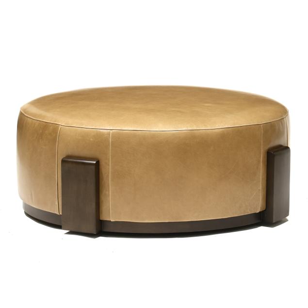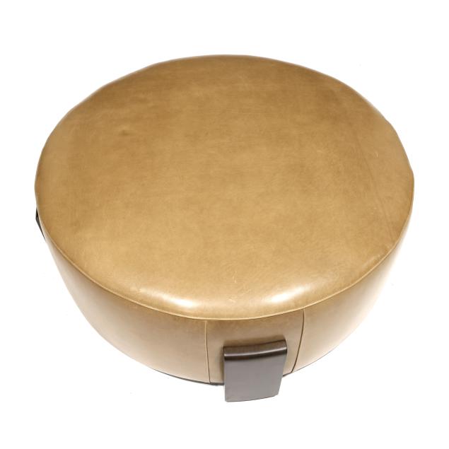 Circular form, tan leather with paneled mahogany legs, labeled.