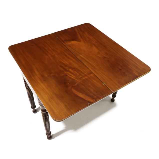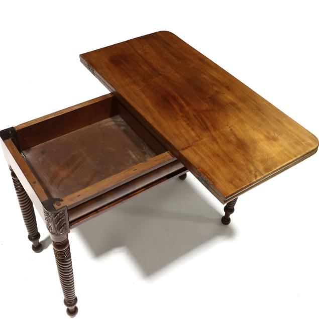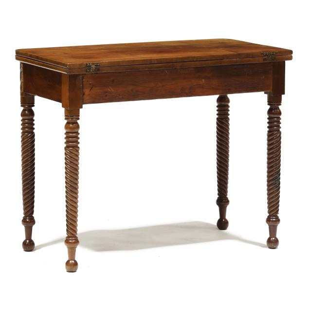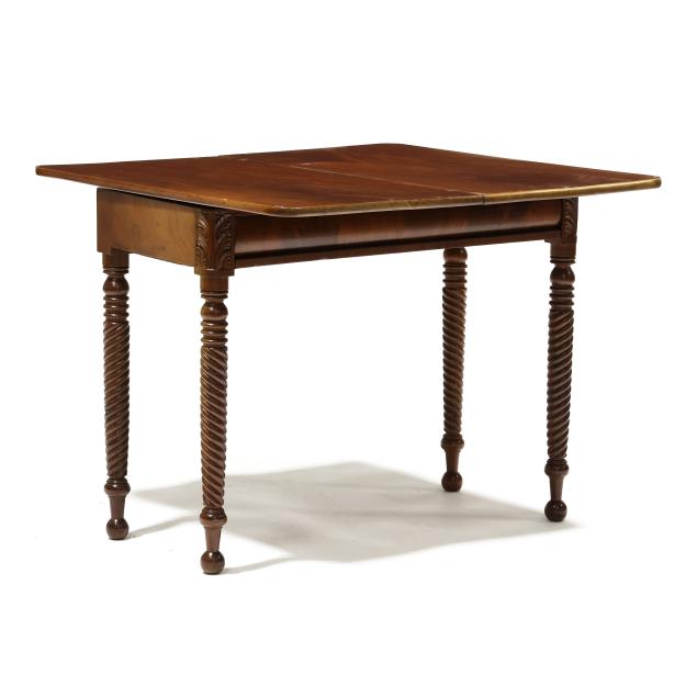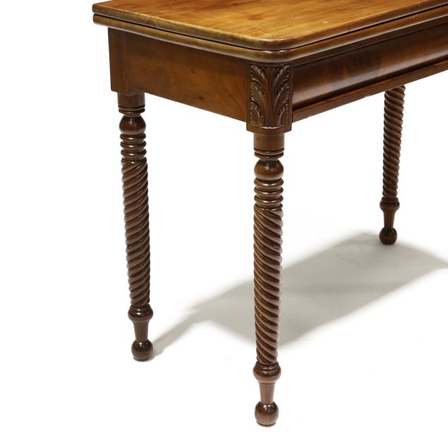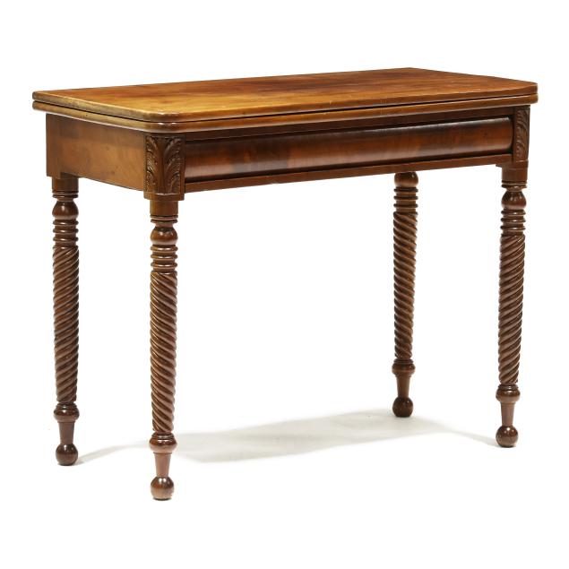 Circa 1840, mahogany, mahogany veneer, white pine secondary, swivel hinged top with underside storage compartment, ogee skirt, acanthus leaf stiles, spiral twist legs on ball feet.