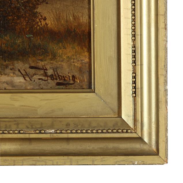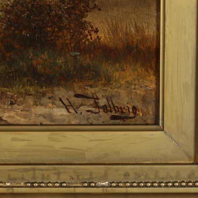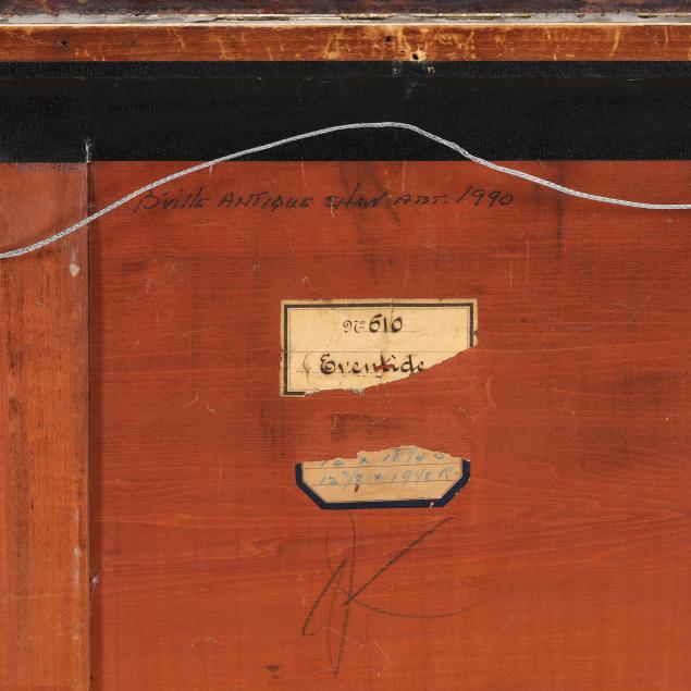 Oil on panel, signed at lower right, retaining old labels to verso, inscribed "B'ville Antique Show Abt. 1990" to verso, presented in a period frame.
