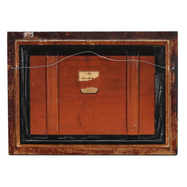 Area of retouch to sky in upper right corner; chipping and later gold paint to frame; areas of beading to inner frame with loss.