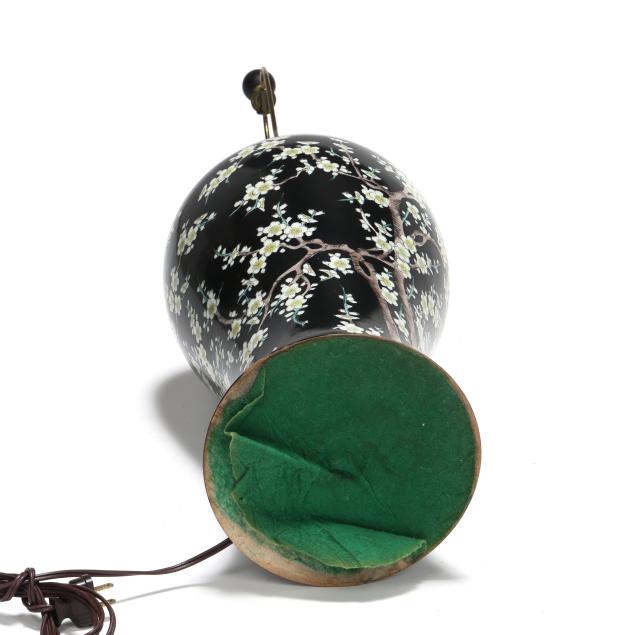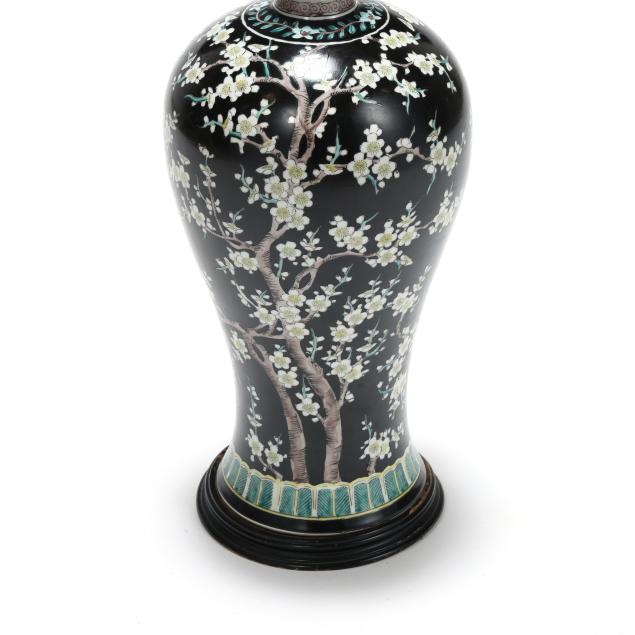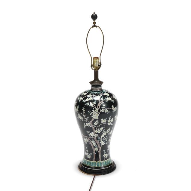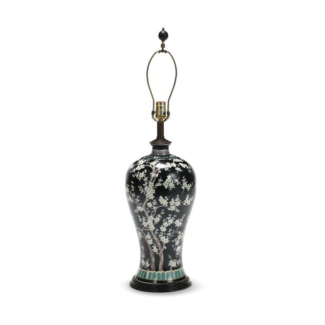 20th century, tapered vase with small mouth decorated, black ground decorated with white plum blossoms, the neck and base with patterned banding, now wired as table lamp with ebonized wood base and metal mount, includes silk lined shades and turned ebonized wood ball finial.