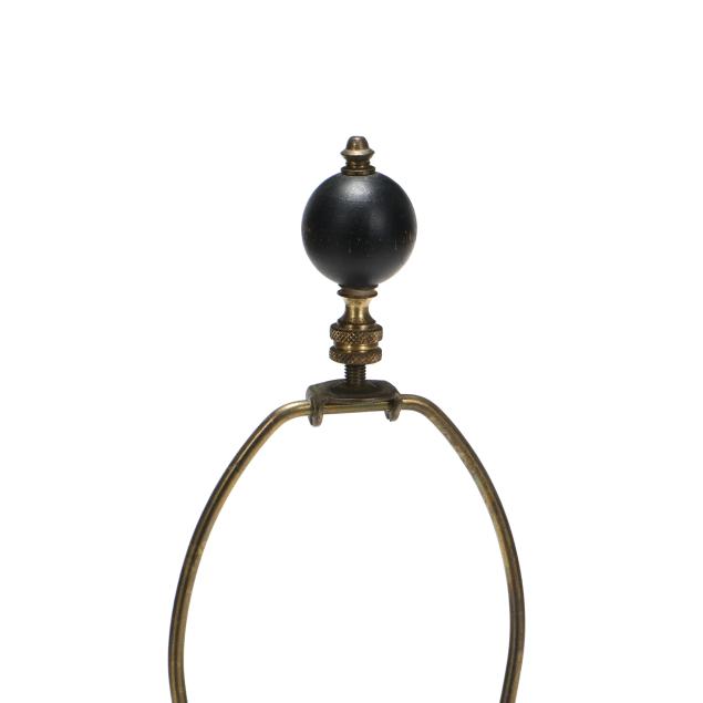 Working at time of evaluation; vase not examined outside of mount; some scuffing and paint loss to wood base and finial; some unevenness to mounting of vase to base;