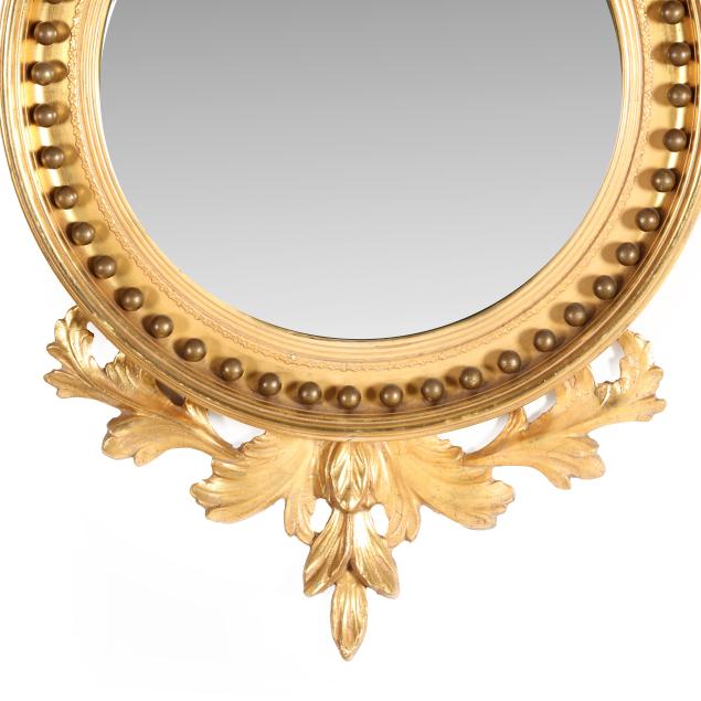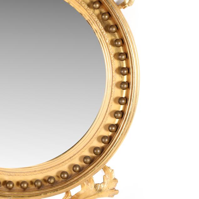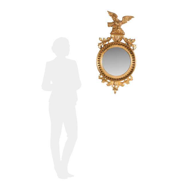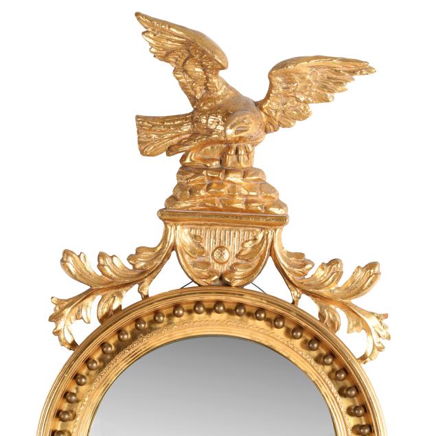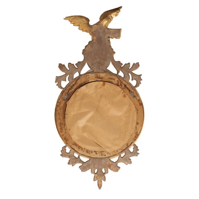 Early to mid-20th century, carved giltwood deep frame with raised bosses, surmounted spread winged eagle perched on rockwork mount above scrolling acanthus leaves, acanthus leaves to apron, unmarked.