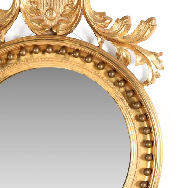 Pediment with areas of looseness and cracking; some cracking to pediment, nick to one leaf at right; bosses with loss to gilt; possible later gilt touchups to frame; water damage visible to verso.