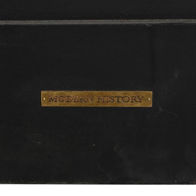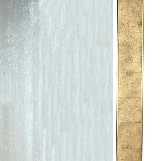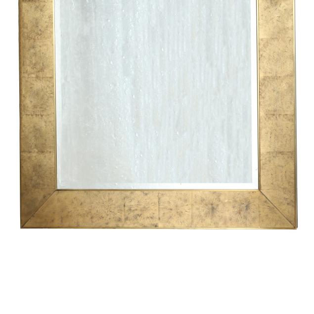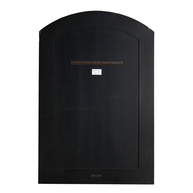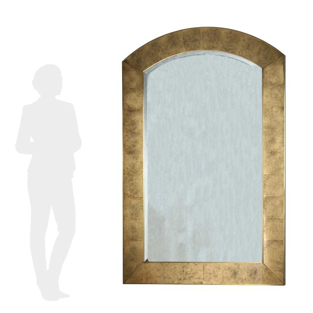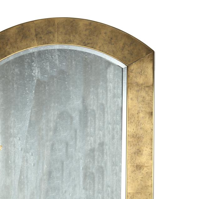 Late 20th century, with gold leaf eglomise glass surround, arched form with beveled mirrored glass, labeled.