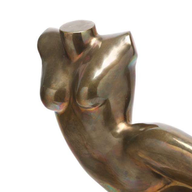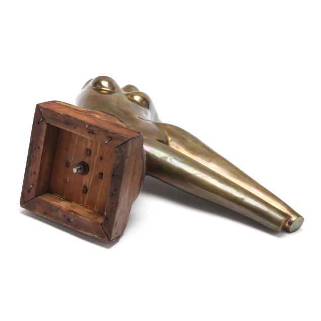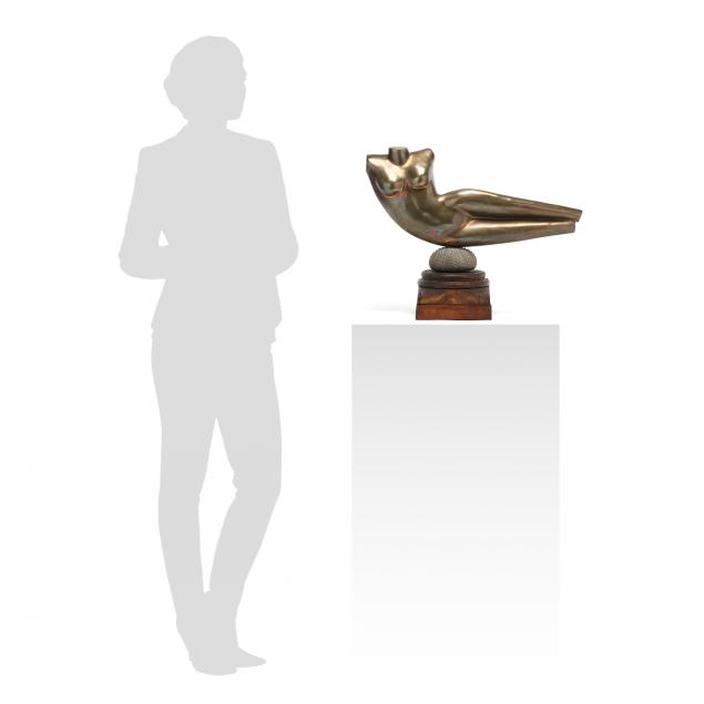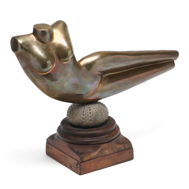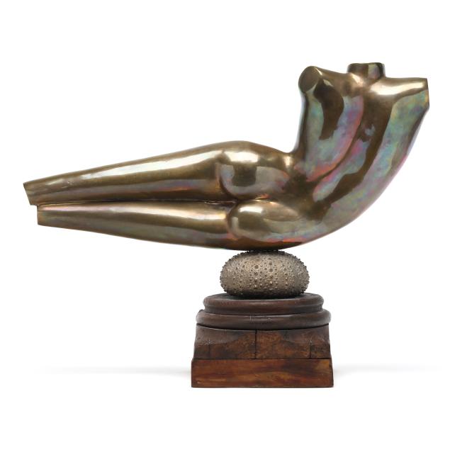 Patinated bronze odalisque figure mounted to a bronze urchin form plinth, signed and edition numbered 3 of 12, mounted atop a reclaimed wood base.