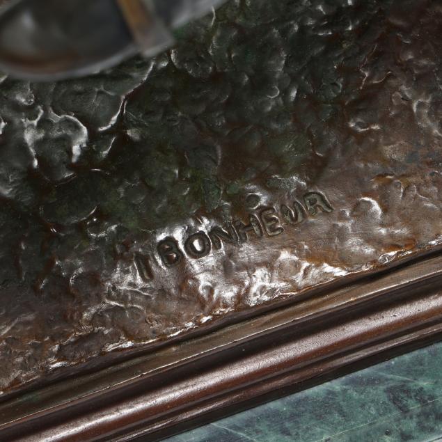 Patinated bronze, signed "I BONHEUR" to the terrace, mounted to a green marble base with engraved brass gallery plaque.