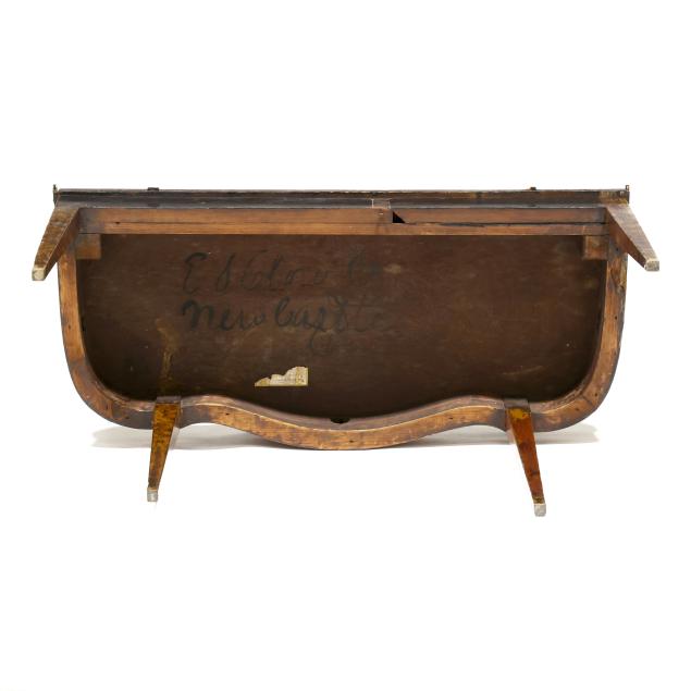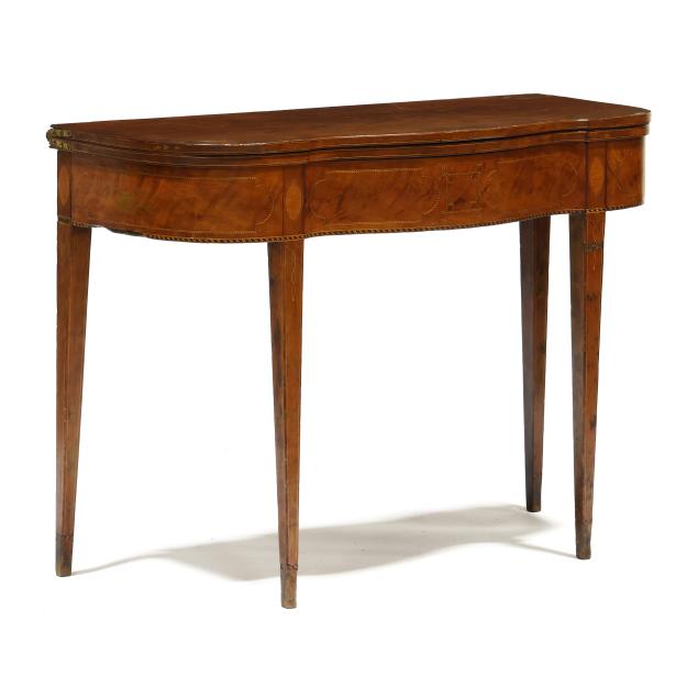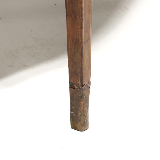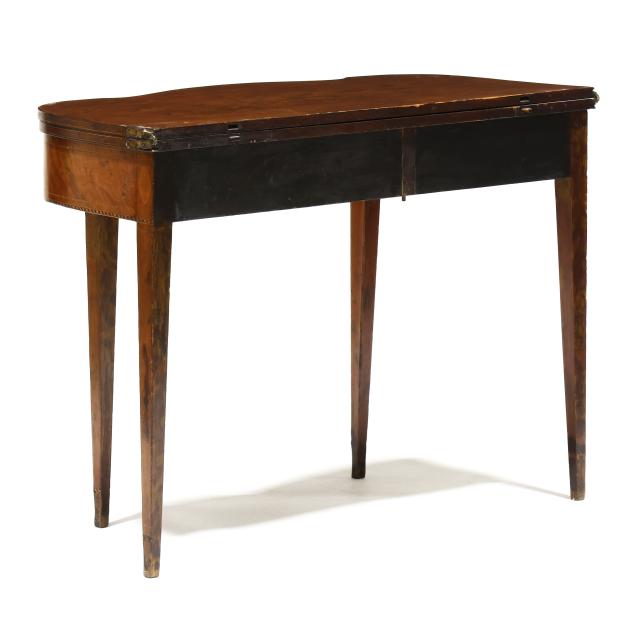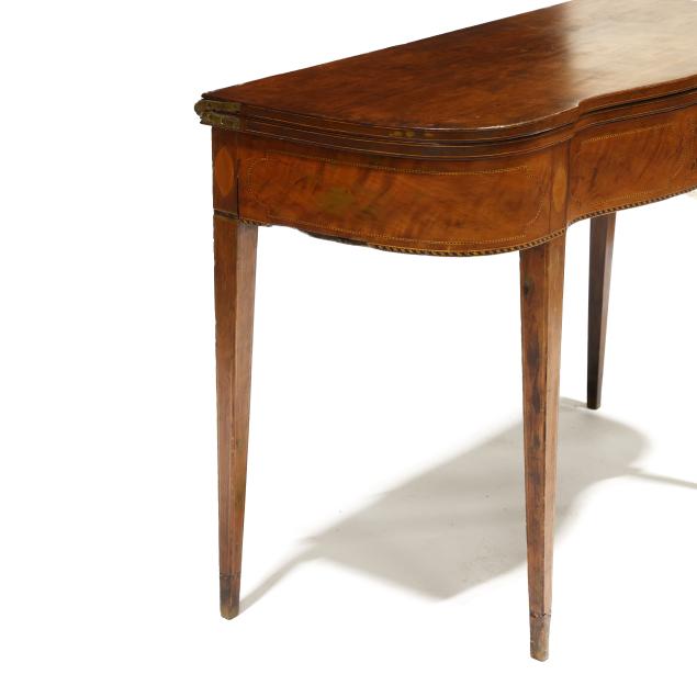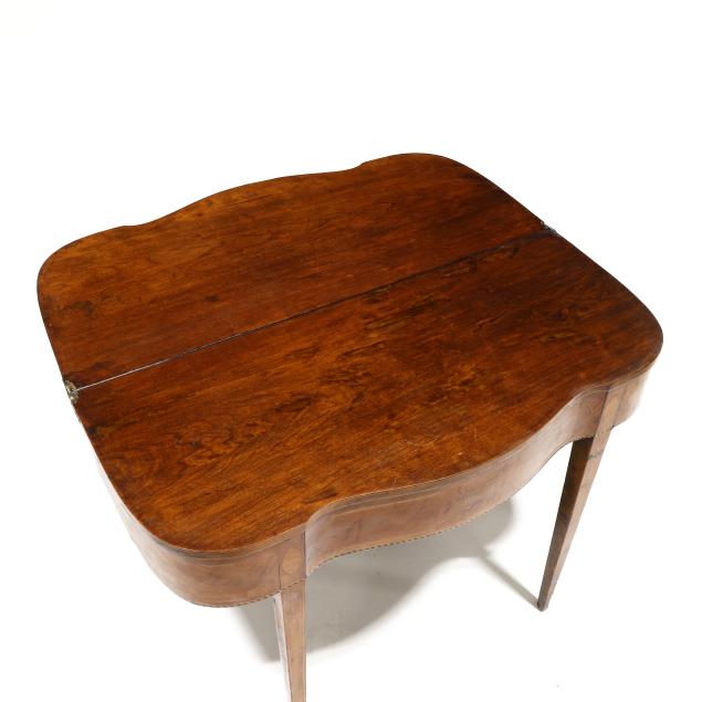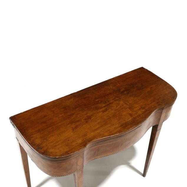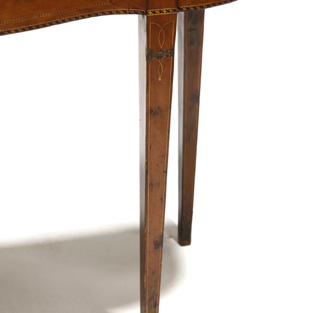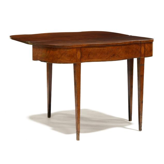 Late 18th century, mahogany veneer with light and dark wood inlays, white pine secondary, hinged top with single gate-leg support, conforming skirt with barber pole line inlays, straight tapered legs with intertwined line and cuff inlays, the underside with old black paint inscription "E. S. Cl..... / New Castle" likely referencing Delaware.