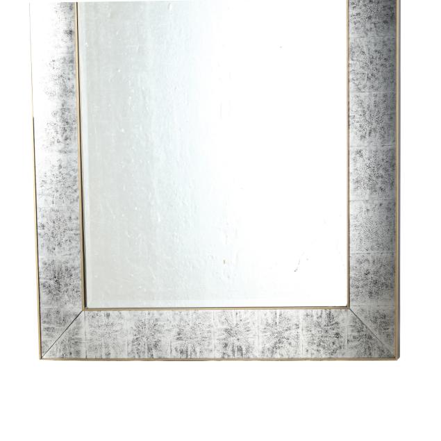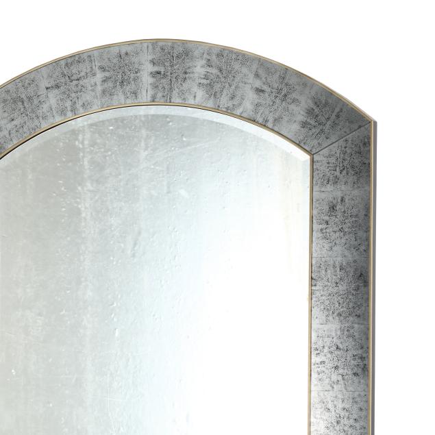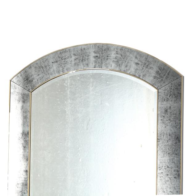 Late 20th century, with silver leaf eglomise glass surround, arched form with beveled mirrored glass, labeled.