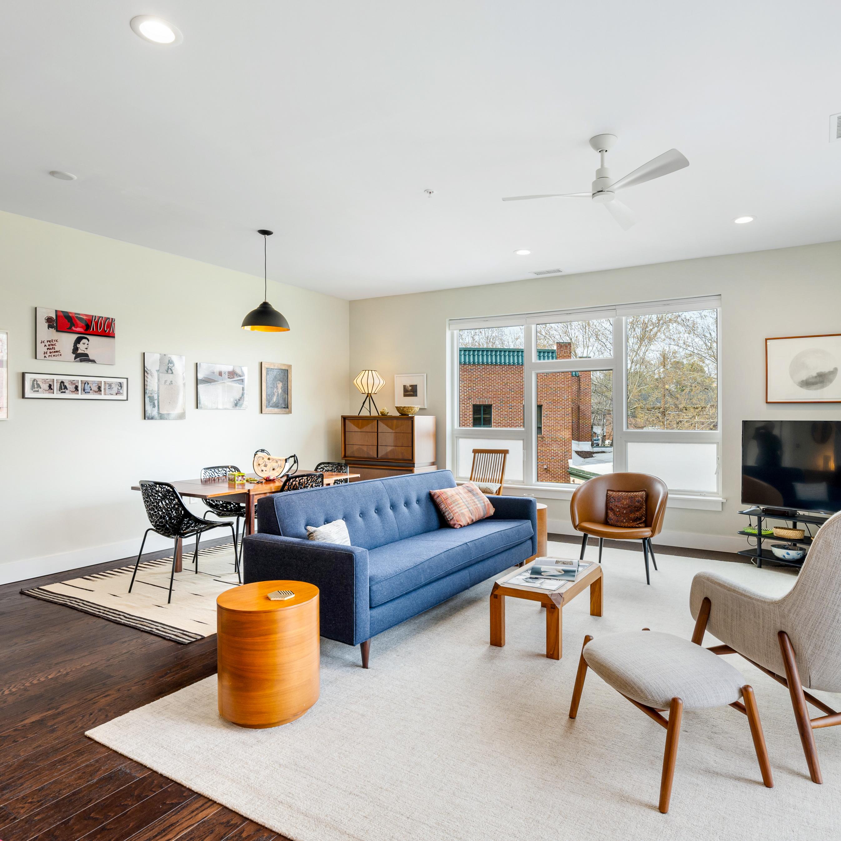 Delight in the symphony of style and sophistication at 515 Churton #307, a light-filled top-floor end unit overlooking the manicured lawns of Historic Hillsborough's Town Hall. Steps from beloved shops and eateries via charming sidewalk-lined blocks, this residence captures the town's timeless allure with contemporary grace. From concept to completion the design and planning of 515 Churton reflects open collaboration with residents and the Town of Hillsborough’s Historical Committee. Although the character of the building is of a contemporary nature, the materials mimic much of what was previously used in the district's remaining architecture, such as corrugated metal, masonry, natural siding, and glass.